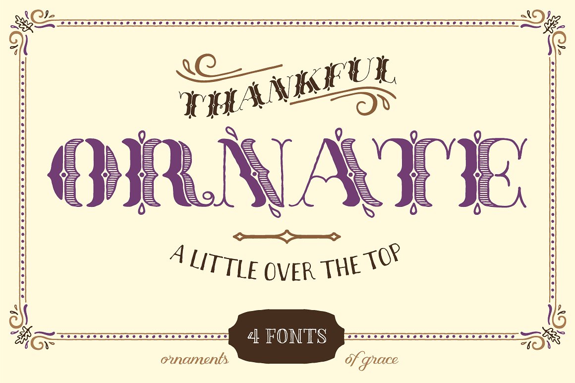 感恩华丽是一个高度装饰的字体,灵感来自现代复古手写。精致,但大胆和滑稽,感谢华丽会很快用老式的好幽默装扮你的设计,是首字母、标题的理想选择。
