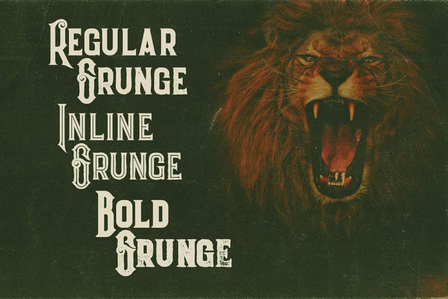 独特的复古风格自定义衬线字体,带有6种风格: 普通和grunge,内联和内联grunge,粗体和内联粗体grunge。