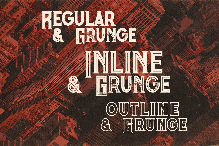 独特的复古或现代风格的定制字体,带有6种风格: 普通和 grunge, 内联和内联 grunge, 大纲和大纲grunge。
