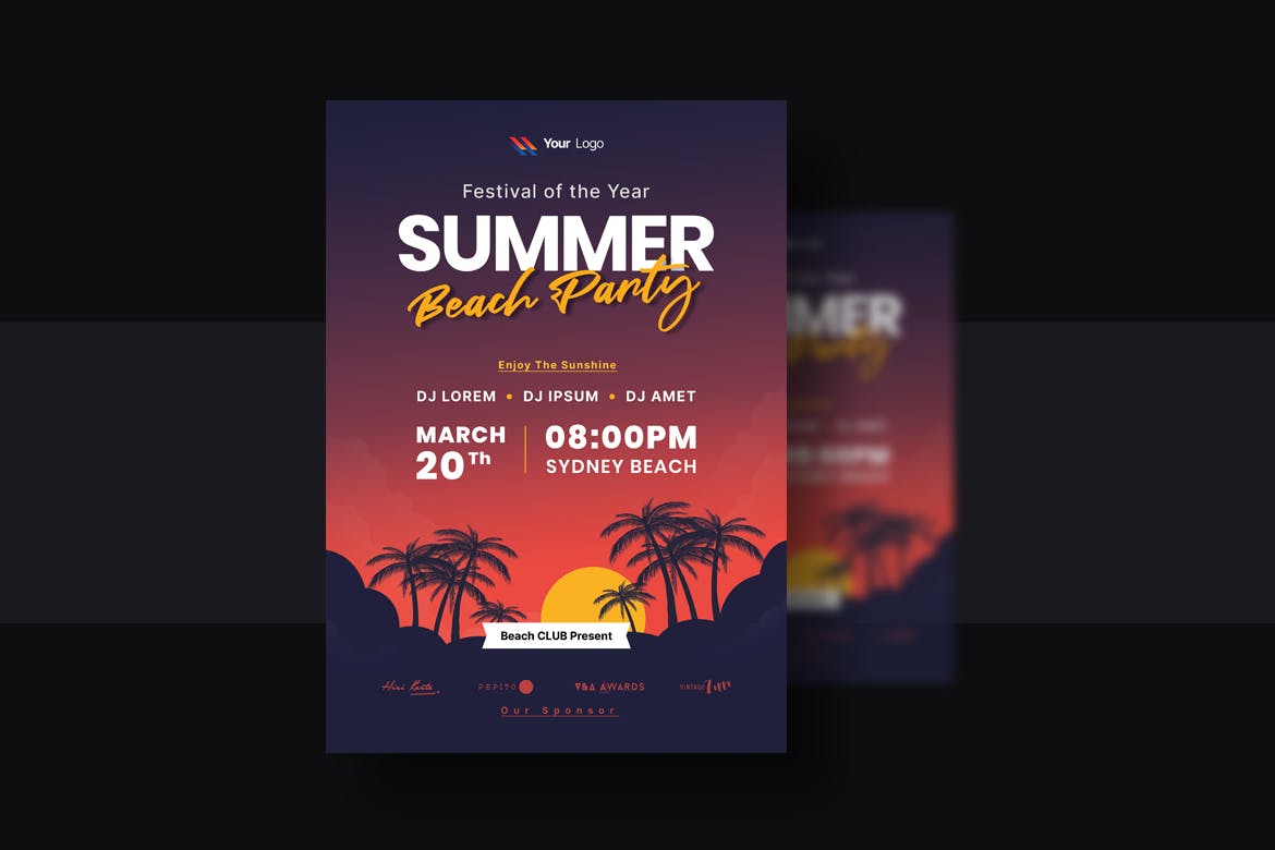 这次分享的是,热带夏日海滩派对传单和海报,改广告设计适合各类相应的活动或节日主题广告,或者商场促销广告设计参考,enjoy!