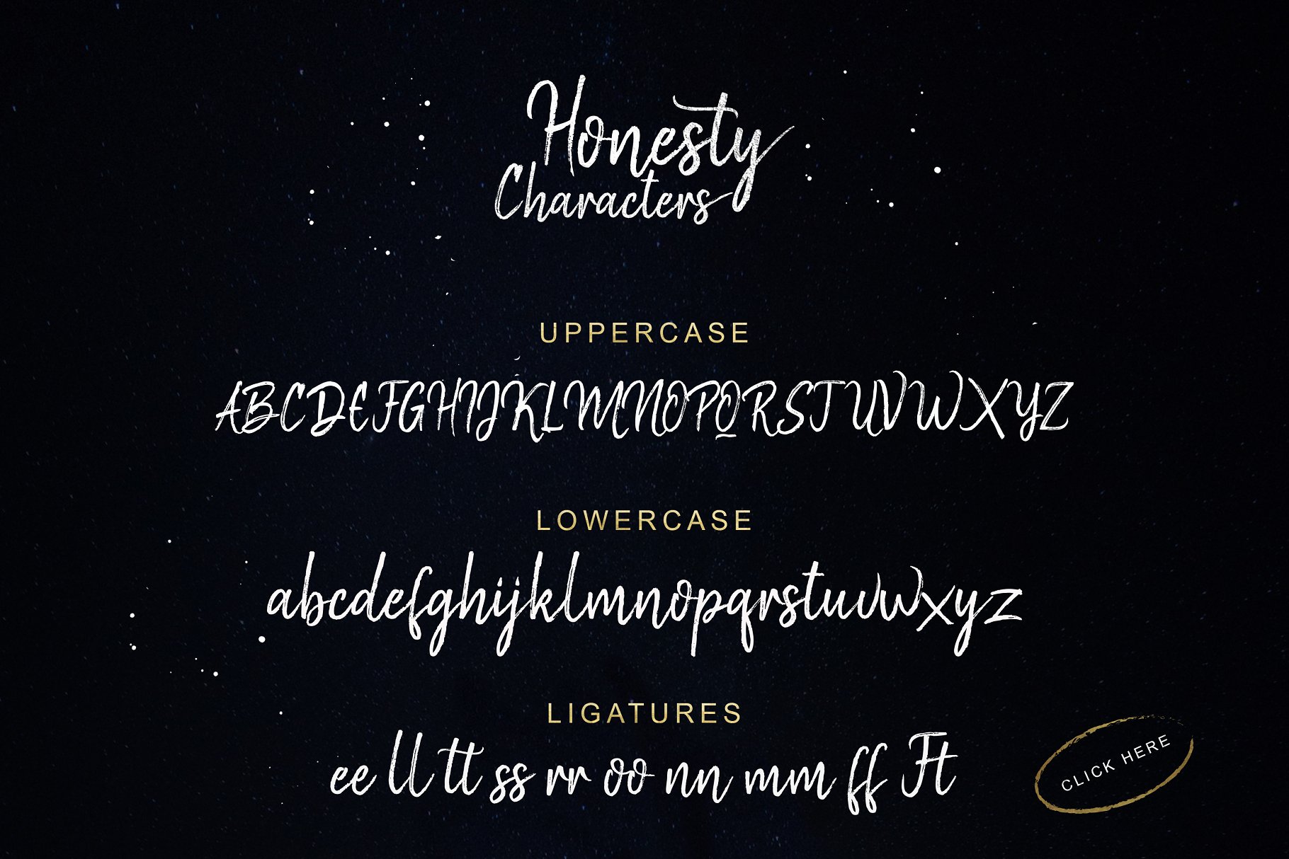 Honesty 脚本是一种全新的、自然的手写字体。这种字体给设计师在不同的项目中工作的自然感觉,是邀请贺卡、品牌材料、名片、报价、海报、徽标、婚礼用具等等的完美选择!