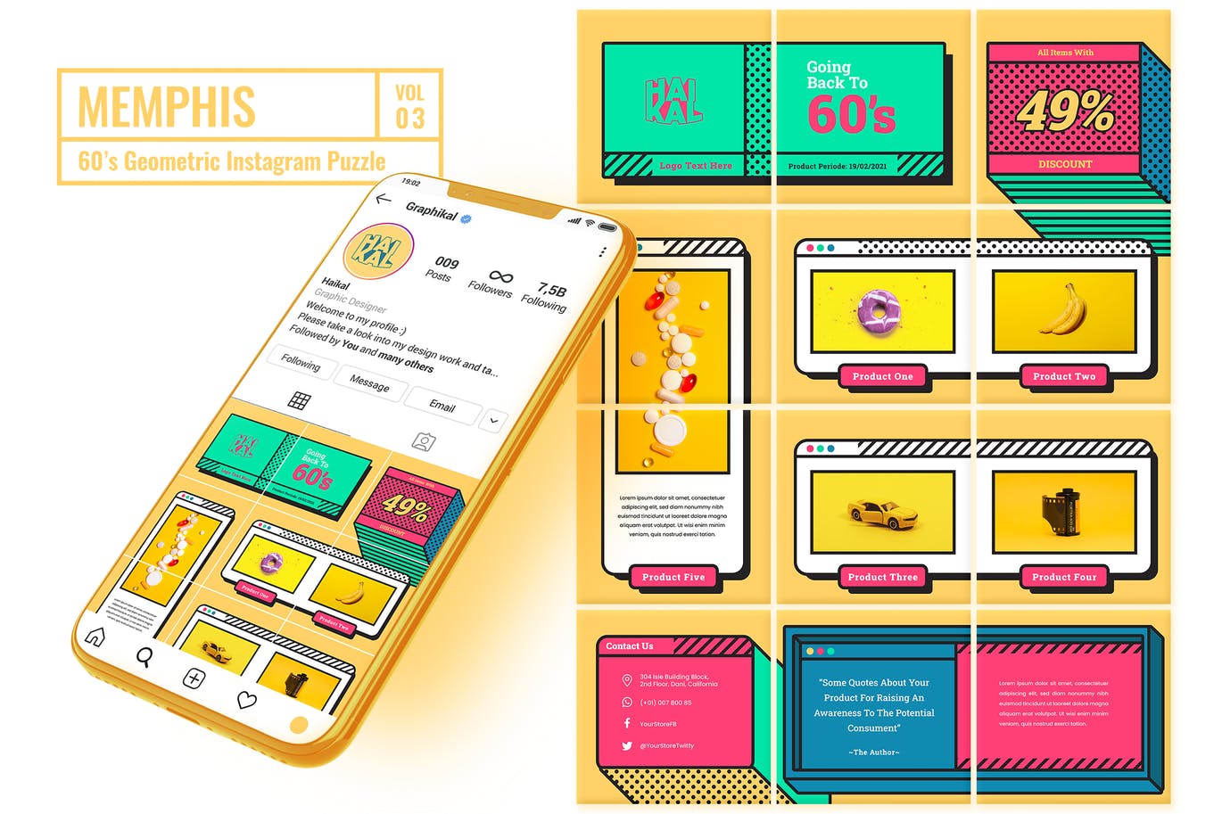 这次老不湿分享的是,时尚高端90年代孟菲斯风格Instagram社交媒体banner海报设计模板-AI,EPS,PSD,这12条拼图帖子不会浪费您的时间来编辑模板,因为它被编译为一个文件(仅编辑单个文件),最终结果将是12条可以上传的Instagram帖子!