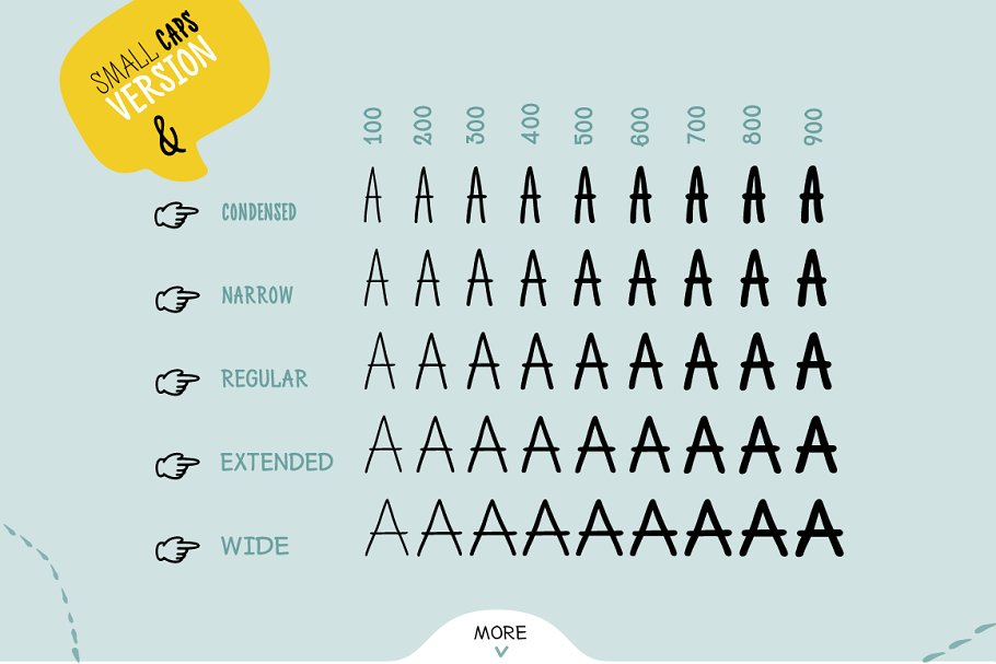 这些字体权重中的每一个都包含一些扩展类型——压缩型、窄型、正则型、扩展型和宽型。