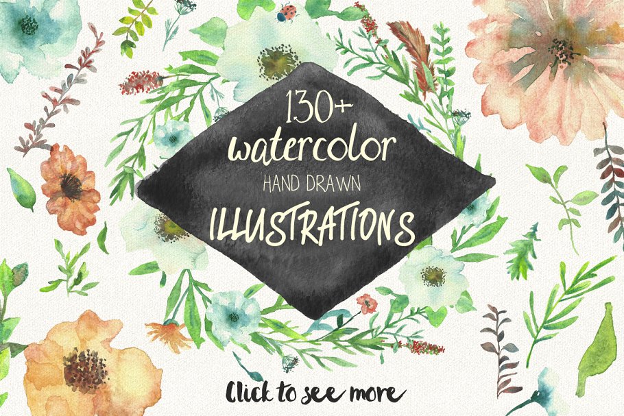 这个集合包括手写字体、水彩花卉、横幅、漩涡和飞溅。