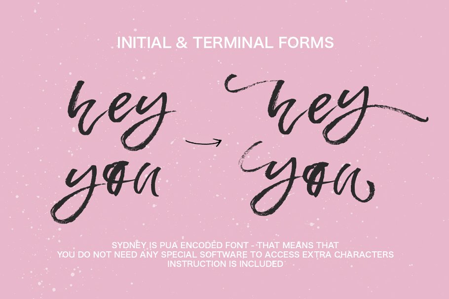 Sydney 是婚礼用品、海报、照片覆盖和数字字母的完美字体,因为它有最常用的小写字母(都是PUA编码)和全套特殊的初始和终端形式。