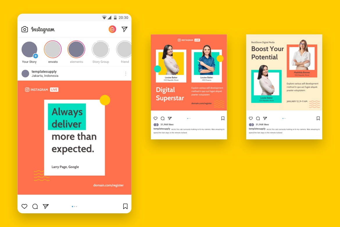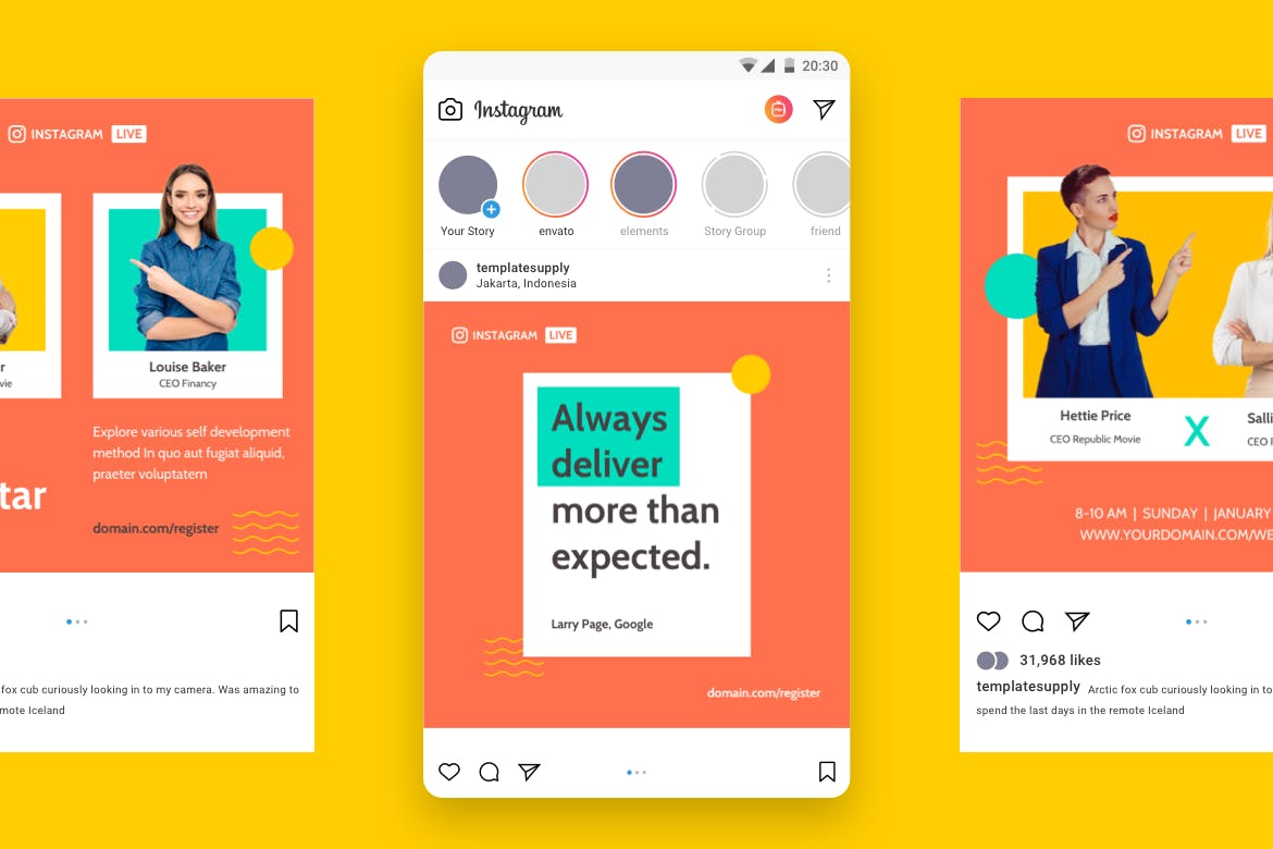 这次老不湿分享的是,简约时尚清新高端大字报风格的Instagram社交媒体banner海报设计模板-PSD, SKETCH, XD, FIG,向您展示Instagram帖子以推广您的业务,在线网络研讨会,课程,讲习班,培训和其他相关业务。该软件包非常适合吸引您的关注者,通过您的内容获利以及将访问量引导到您的网站,商店和个人资料。