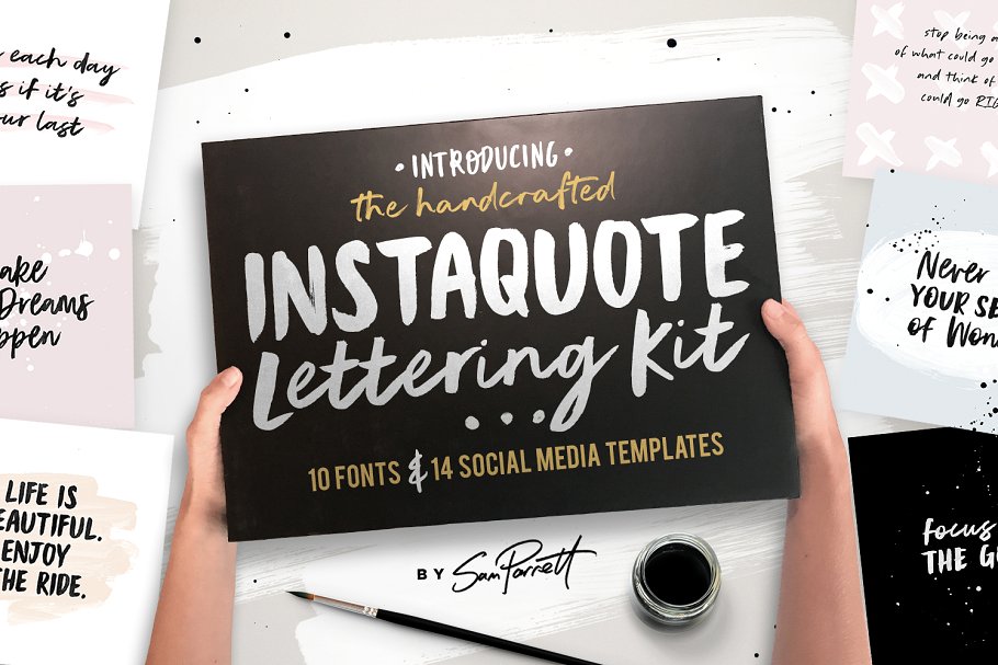 向Instaquote字体工具包问好!一个手工制作的10个字体集合和14个社交媒体模板设计成和谐工作。你不仅可以混搭和匹配不同风格的手写字体,来创造漂亮的字体,你也可以把它放在定制的,手工制作的背景在一个闪光中。
