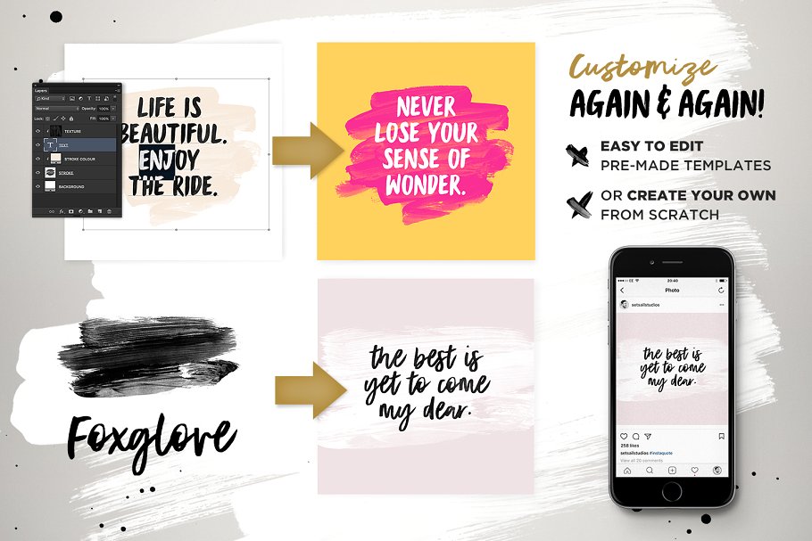使用预先制作的Photoshop模板(PSD文件)或使用单个透明图像元素(PNG文件)从头设计自己的。这就是创建时尚的社交媒体feed 所需的一切,定制字体设计,定制到你的品牌,在一个方便的产品中。