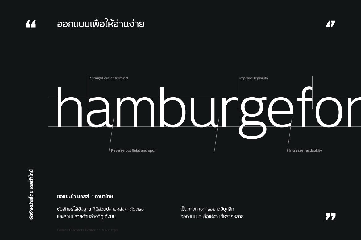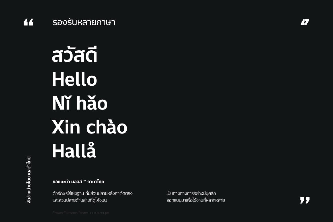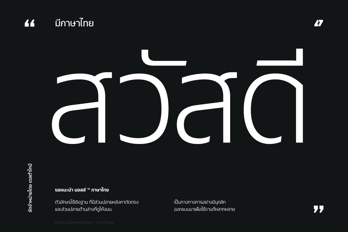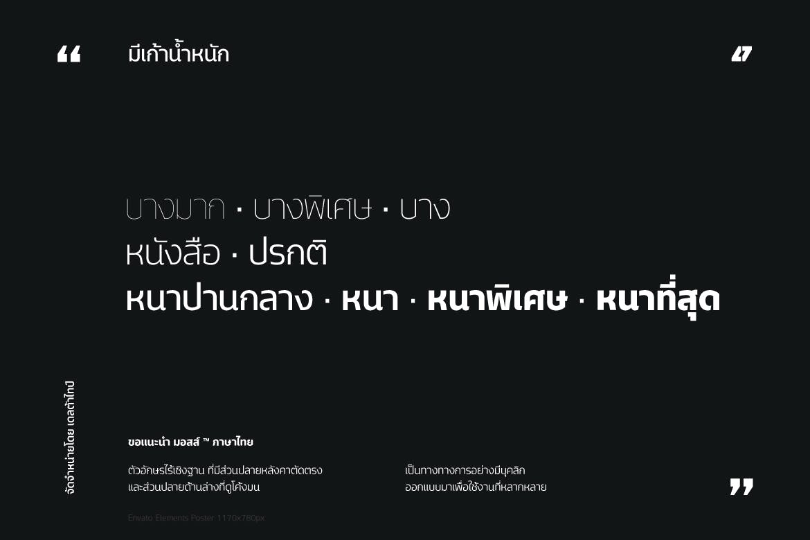 这次老不湿分享的是,高端优雅的Mosse Thai无衬线字体,旨在提高可读性,正式但随意,在终端采用直切,在尖刺和顶部采用反向倾斜,使其略微甜美。Mosse简单而且完全相同,配有9个砝码,让您可以按正确的比例使用合适的重量。由于扩展的拉丁字形,Mosse还支持多种语言。Mosse带有标准的Adobe Latin 4字形,支持世界和mark2mark。