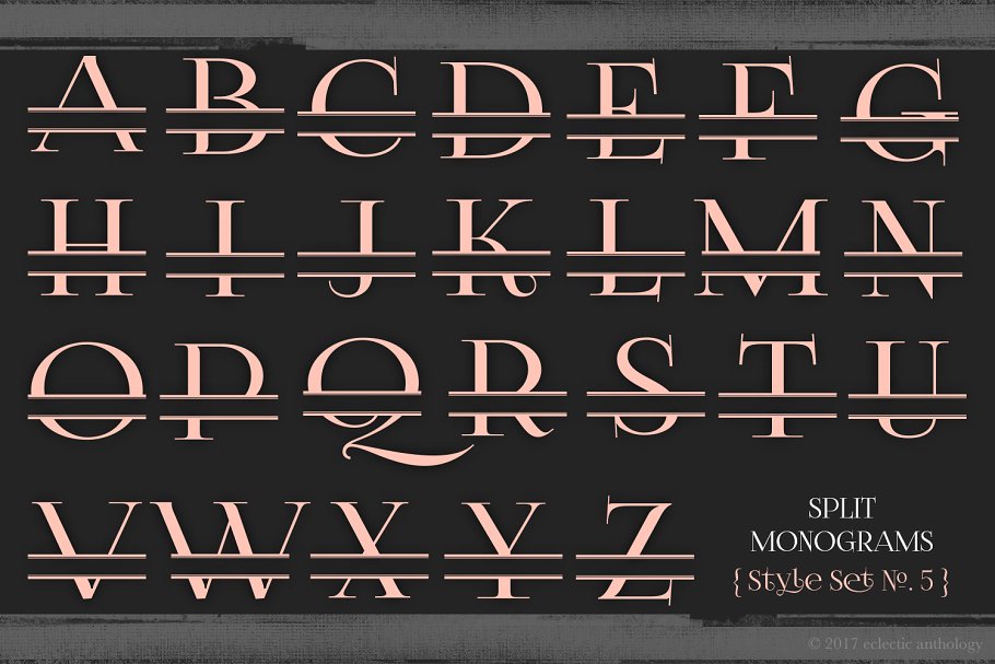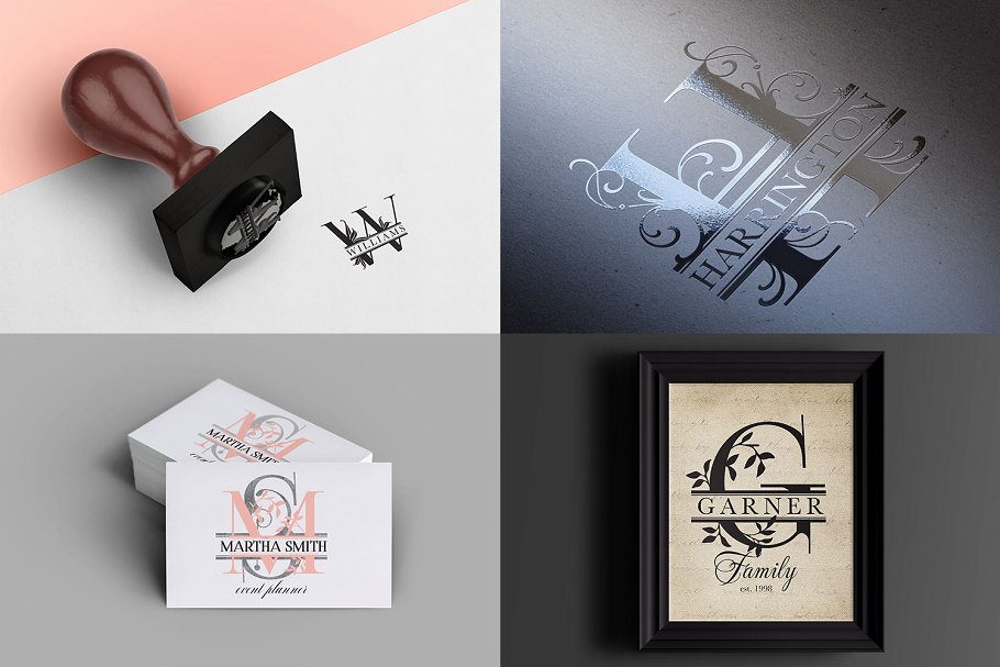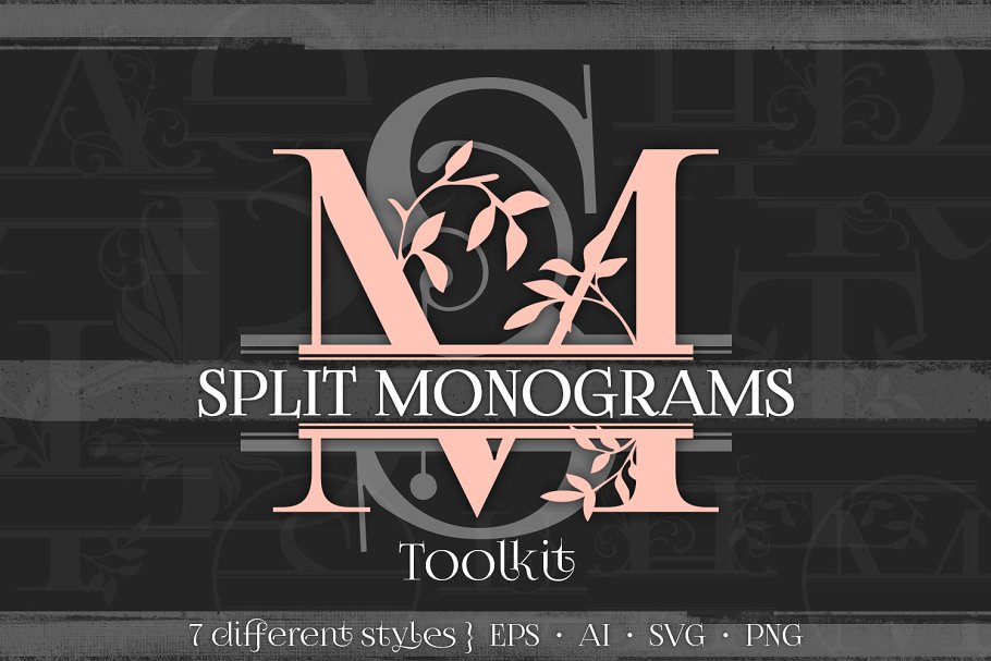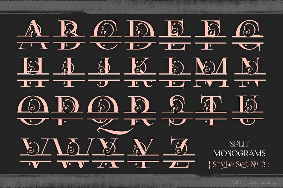 这个分裂的字母组合工具包包含7种不同风格的字母组合,从基本的到精心设计的。有叶子、卷发、漩涡等等。这些多才多艺的图形非常适合邀请函,在便签上的首字母,标志,墙壁艺术,名片,等等。它们是美丽的,独自站着,或者铺上新的一层。