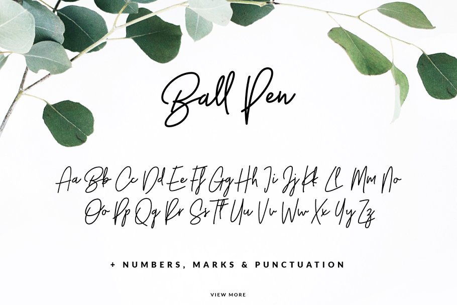 Ball Pen 带有大写和小写的基本字符、数字、标点和标点符号。换音符号也适用于西欧和中欧语言。作为一共特征你也有一个代表的连接字母, Alternates 和Swashes。