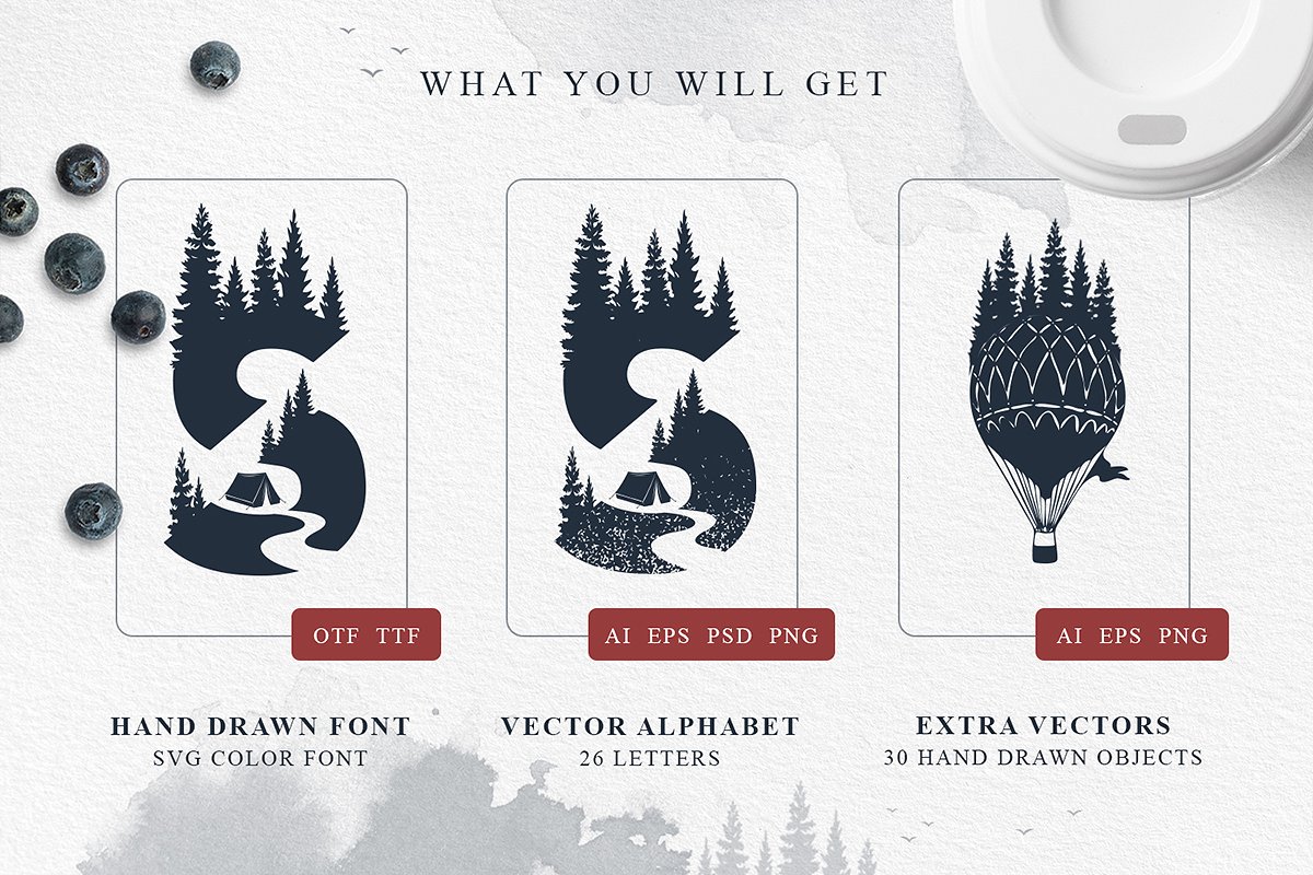 具有双重曝光效果的现代字体,运用在您的设计中看起来很棒,里面有森林、山、动物等素材,适用于网页设计、服装图案、海报和更多您能想到的,enjoy!