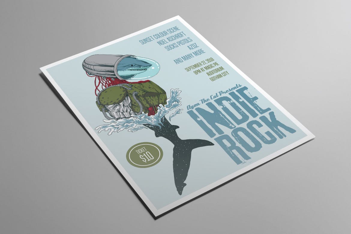 这次老不湿分享的是,高端个性的鲨鱼独立摇滚传单海报设计模板-AI,PSD,此矢量艺术插图传单旨在促进您的创意业务,例如音乐(独立摇滚/另类/地下音乐会),或其他创意领域,例如艺术和社区海报。