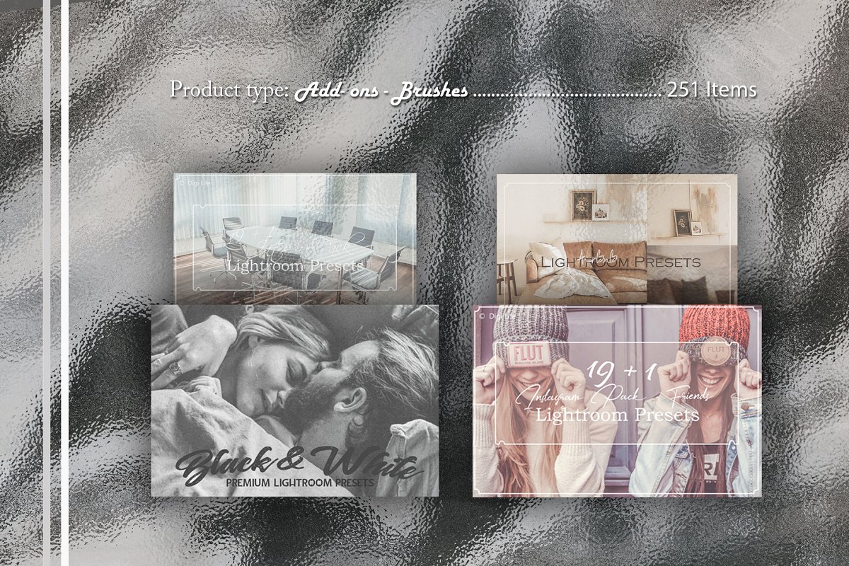 此套装包含了251种专业制作的预设,各种不同的风格,适用于所有类型的照片。只需单击一下即可使您的图片变得更加专业。通过使用这些专业的Lightroom预设,可以增强人像照片效果并加快工作流程。非常适合用于人像、旅行、博客、肖像、美术摄影、时尚、生活风景以及所有的创意摄影。