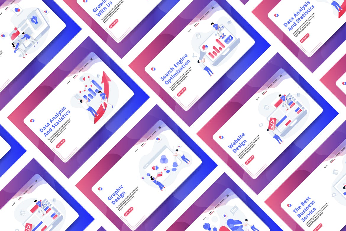 这次老不湿分享的是,时尚高端多用途的创意商业矢量插画插图banner海报着陆页设计模板集合-EPS,AI,JPG,可以用于移动应用程序,网站登陆页面,横幅,海报。