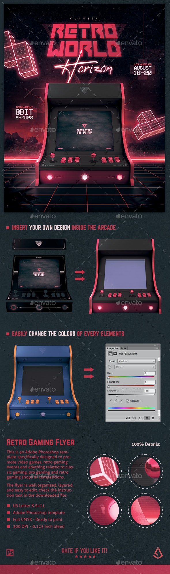 这是一个复古游戏视频游戏传单psd模板,旨在宣传复古游戏活动,格斗游戏锦标赛,街机格斗比赛,一般视频游戏,经典游戏派对,街机橱柜或投币游戏,游戏商店和商店以及任何类似视频与80年代或1980年代复古游戏有关的游戏活动。
