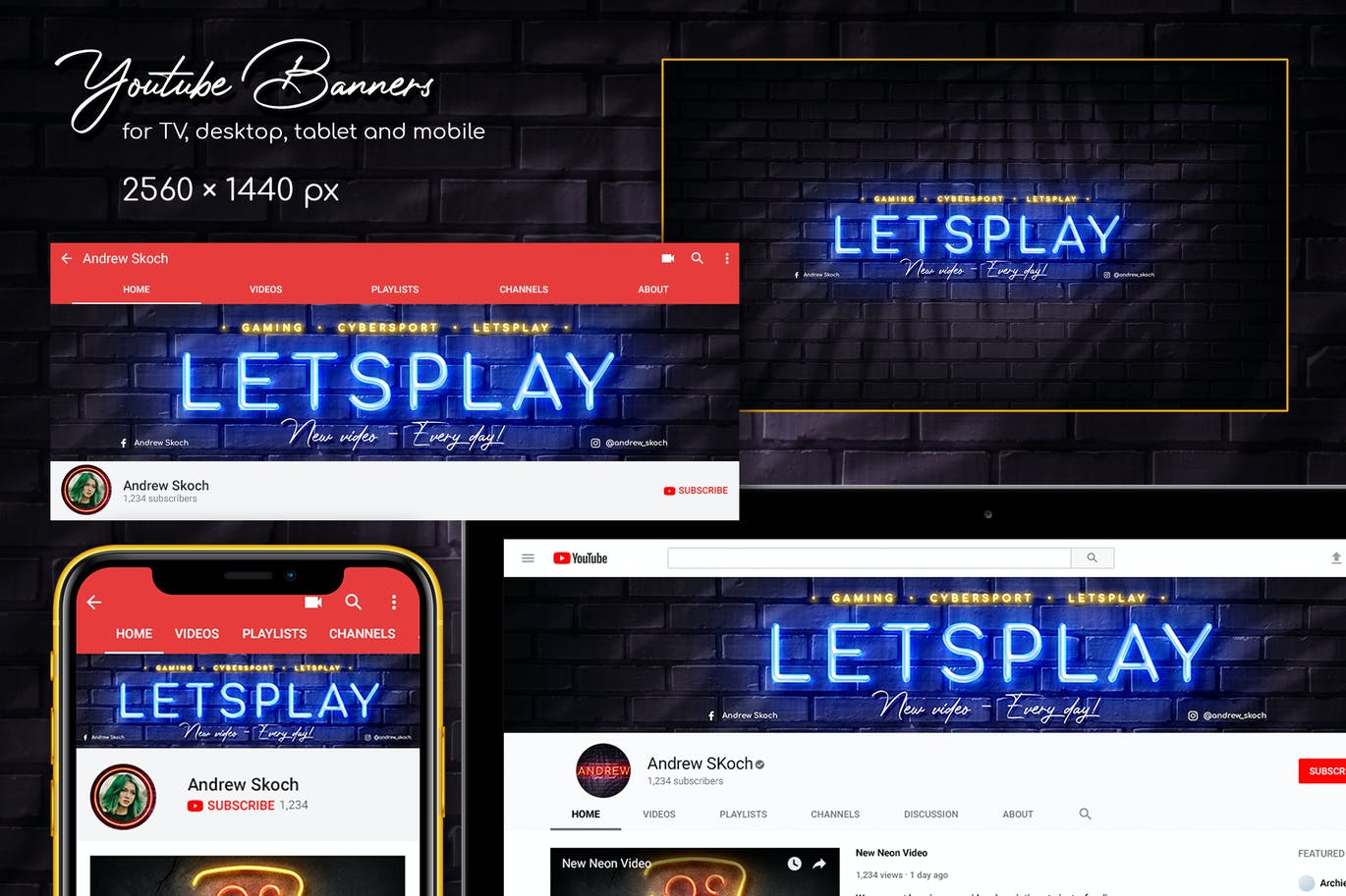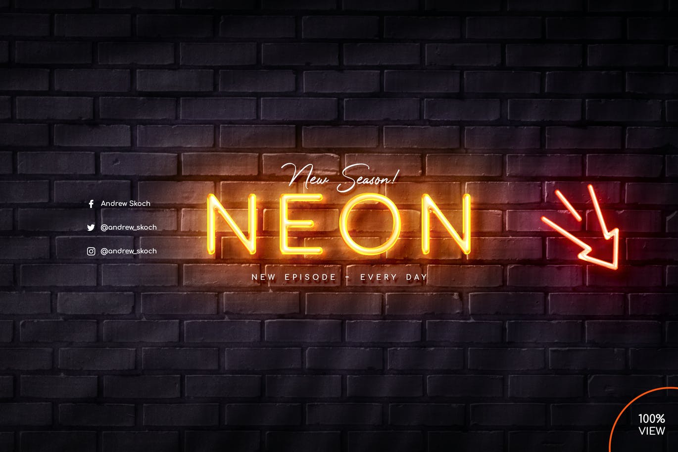 4个独特的YouTube模板以及4种霓虹灯颜色成为您的头条新闻!请稍等片刻,您的YouTube频道将变得充满创意而酷!易于更换图像。只要将您的文本放入智能对象中,它将变成NEON!