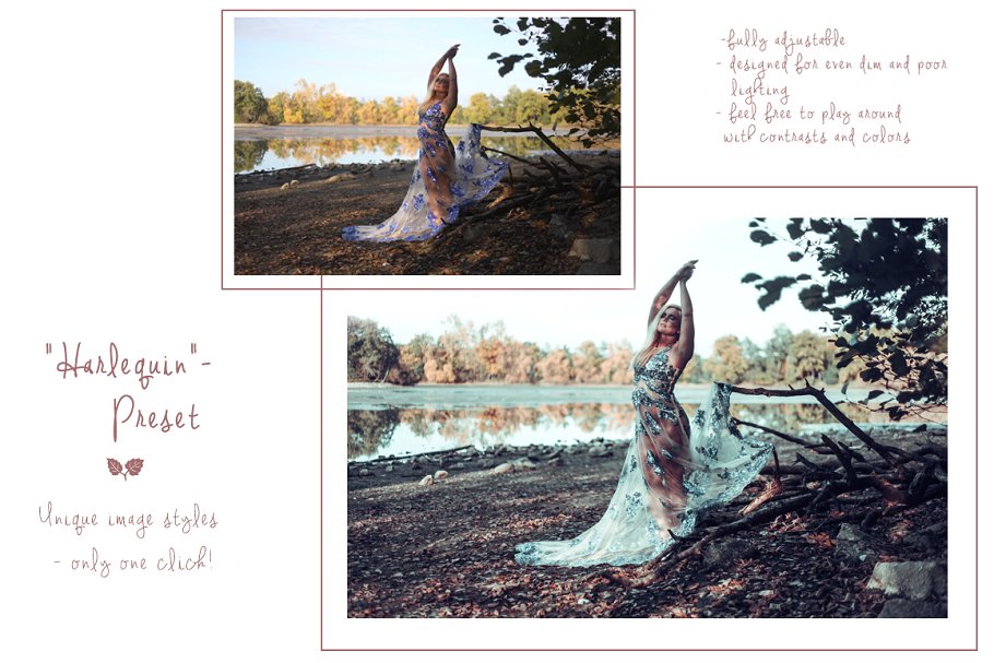 一旦你在你的电脑上安装了这个美丽的集合,你就可以给你的图像一个特定的独特的杰出的外观,只需点击一下。这是最简单和省时的方法。这一套不仅仅是简单的调整光线和颜色,而是给你的照片一个完整的高质量的时尚外观,人们会盯着看。它把各种各样的照片变成了令人叹为观止的奇幻镜头。所有的预设都包含了”secret ingedient”的神奇时尚外观:强大的、深沉的和燃烧的天空没有任何组成。