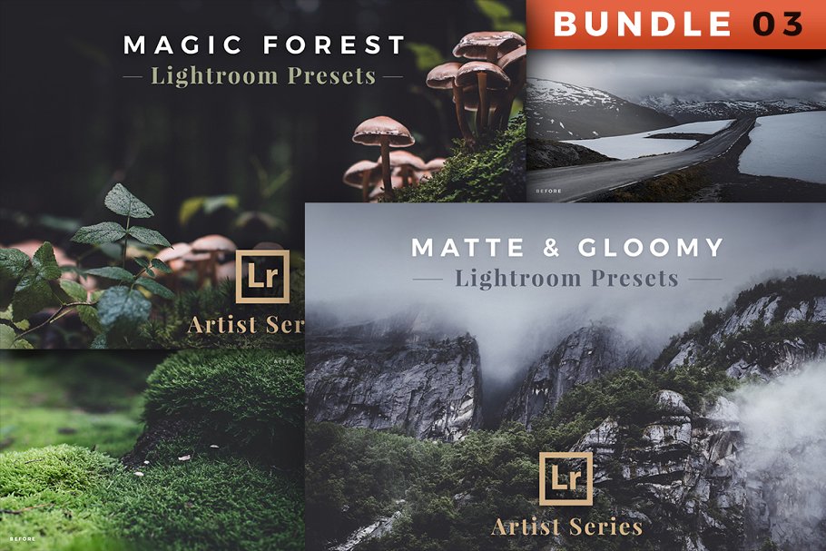 这个包包括两个畅销的艺术家系列产品:魔法森林和哑光&黑暗,总计18 Lightroom预设。