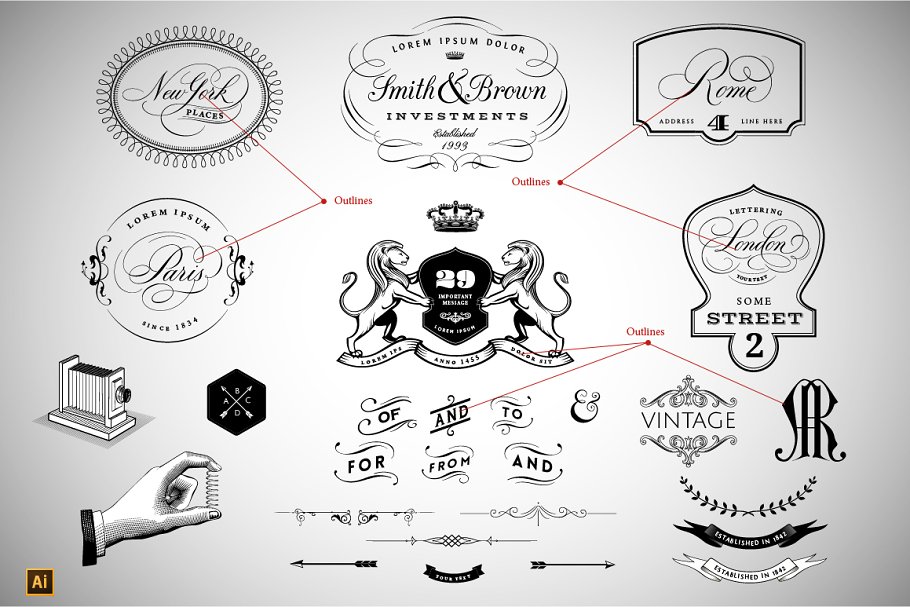 矢量集合: 书画复古设计元素集页面装饰、书画标签与纽约、伦敦、罗马、巴黎等复古设计元素于一体。