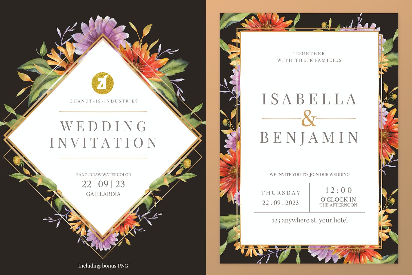 这次老不湿分享的是,高端时尚清新简约手绘水彩风格的花卉花朵植物婚礼请见请帖海报设计模板(AI,EPS,JPG,PNG,PSD),花手绘水彩画,并带有额外的花卉装饰。