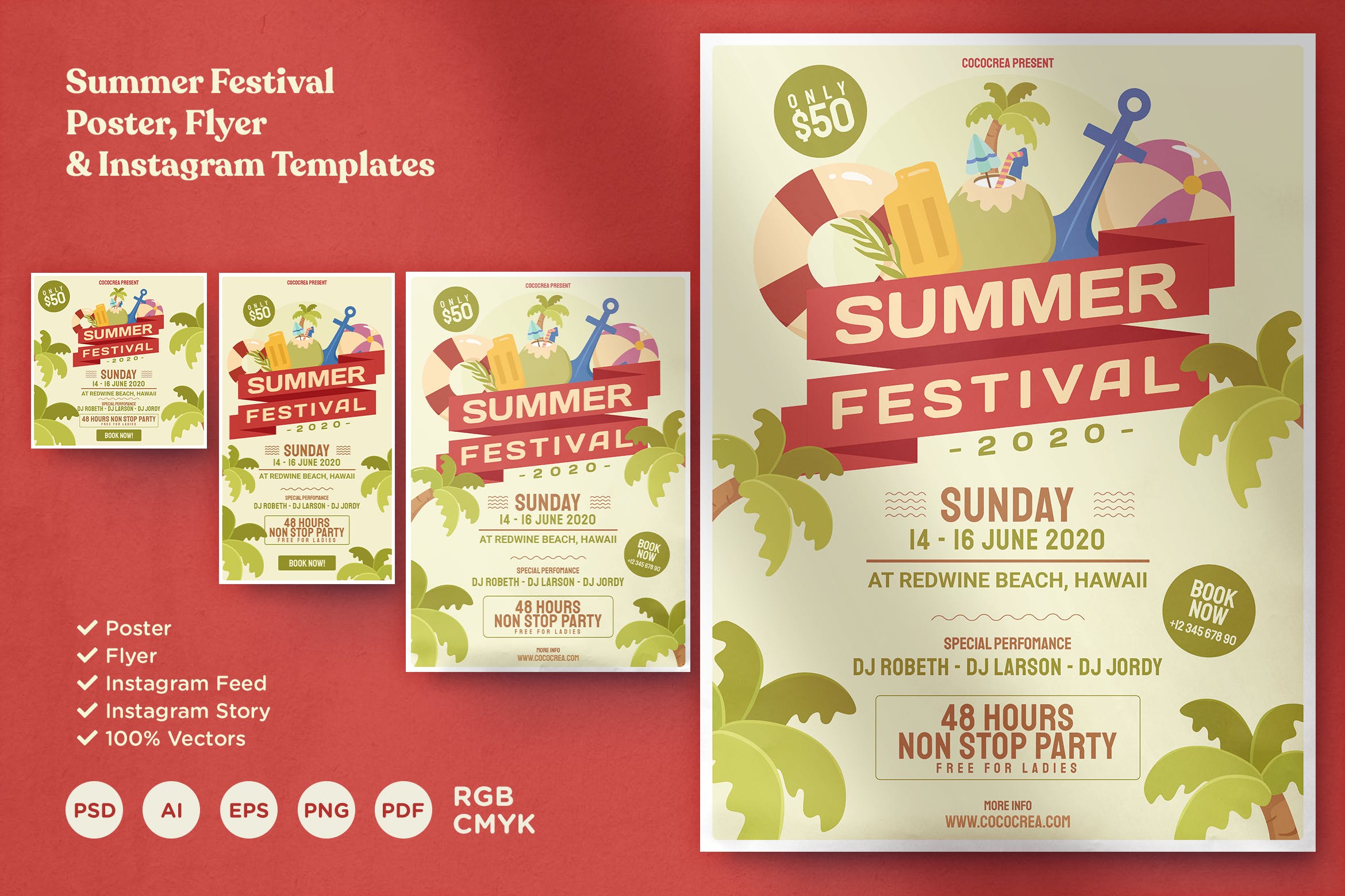 这次分享的是,,用于夏季节日活动的海报,传单,instagram提要和Instagram故事的_print-ready_模板。\\非常适合在任何户外和海滩活动和聚会中使用。\\