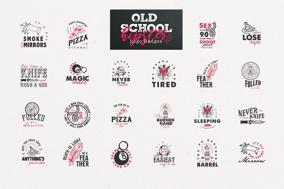 我很高兴向您介绍另一个很酷的标志设计包。这一套包含22个新老学校潮人标志徽章,精心制作,灵感来自复古纹身艺术。 所包含的所有内容都易于修改、编辑和重新调整大小,而不会丢失质量或分辨率。你可以把它们作为你的品牌、标签、包装、t恤设计等等的一部分!