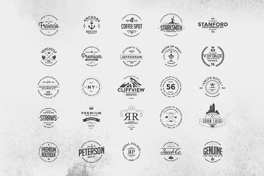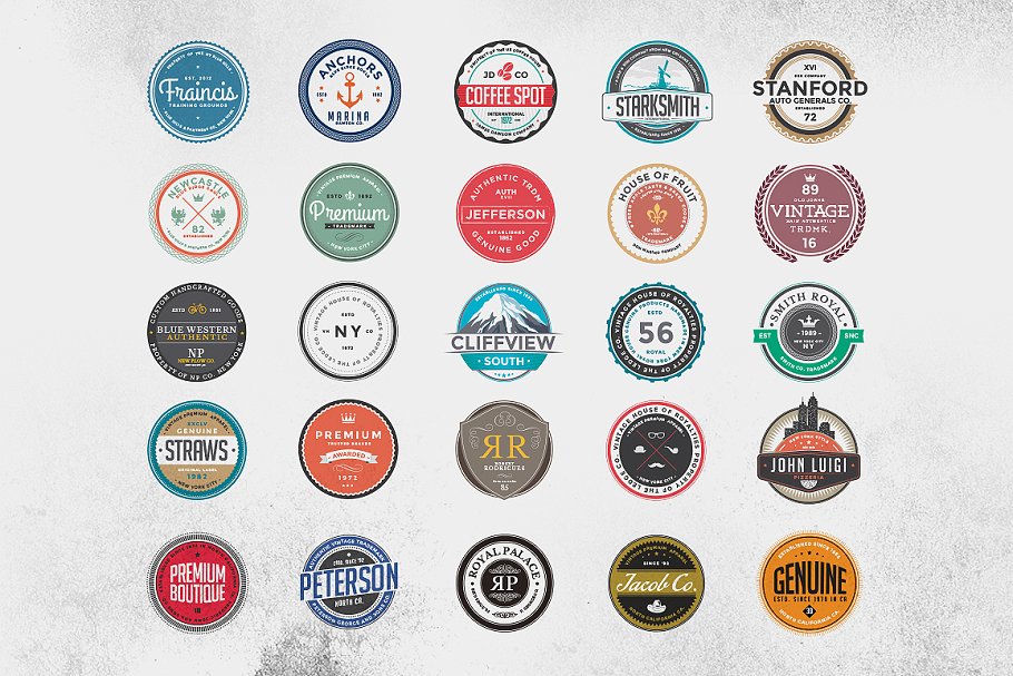 该套包含25个徽章,每个徽章有2个版本,如图所示。AI, EPS和PSD可编辑文件。