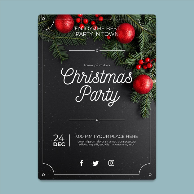 圣诞晚会海报模板,带有照片,有植物、浆果等装饰,它们适用于圣诞节贺卡、墙纸、网站背景、包装纸、贴纸等等。
