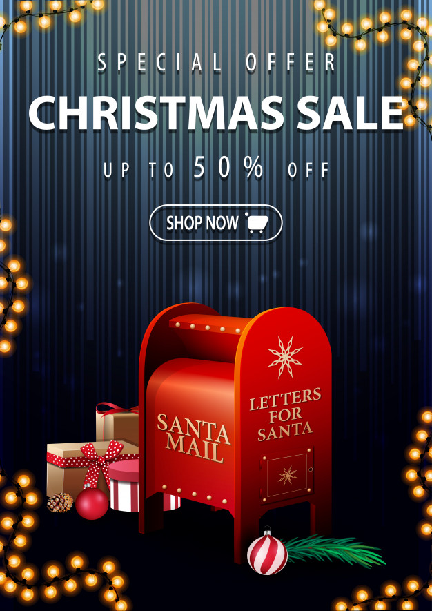 今天给大家带来垂直深蓝色的折扣横幅模板,上面有特别优惠、圣诞特卖、高达50%的折扣等字样,带有圣诞老人礼物信箱等装饰,可以用于海报、网站、宣传单等。