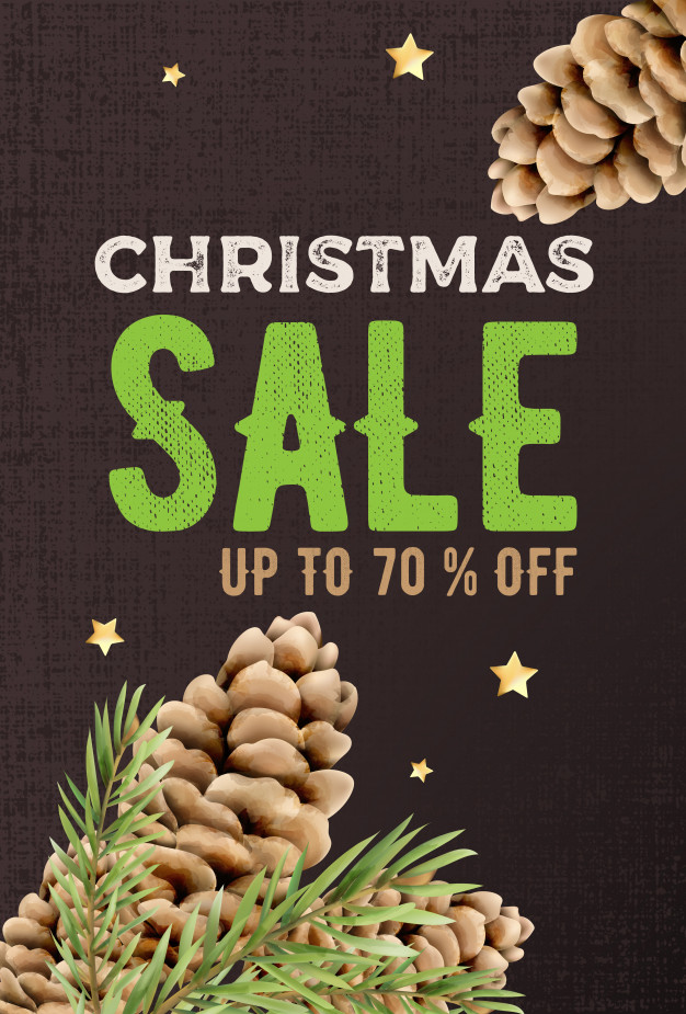 今天给大家带来圣诞特卖垂直横幅模板,上面有最高七折、圣诞特卖等字样,带有针叶树锥等装饰,可以用于海报、网站、宣传单等。