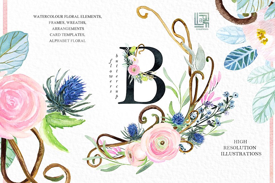 这是一组美丽柔和浪漫的手绘花卉水彩剪贴画合集,是制作卡片模板设计、您的logo、您的博客、邀请函、数字项目、网站、剪贴簿、婚礼请柬等的理想之选!每个元素都画在水彩纸上,尺寸可以在Photoshop或在线编辑器等编辑软件中改变。