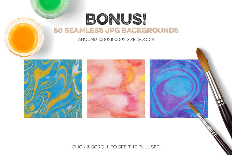 这套工具包括108个矢量元素,30个预先制作的版式徽标,50个Photoshop样式,50个jpg无缝图案,20个预先制作的徽标(仅适用于Photoshop), 30个手工绘制的矢量对象和动物,以及50张额外的png水彩*咖啡污渍图像!