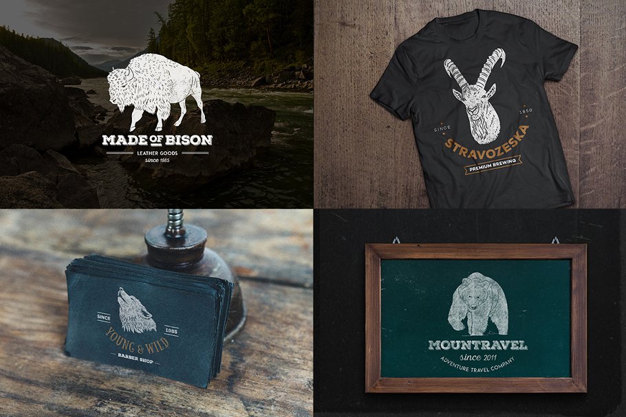 这是带有野生动物图案的老式标志。用不同的姿势展示了9只神奇的动物,总共包含了10+8种不同的logo风格。它们可用于各种用途,如服装、印刷作品、户外相关品牌、包装、手工制品等。这些都是在adobe illustrator和Photoshop中创建的,保存为CS4和CS6格式,也可用于psd文件中的插图。