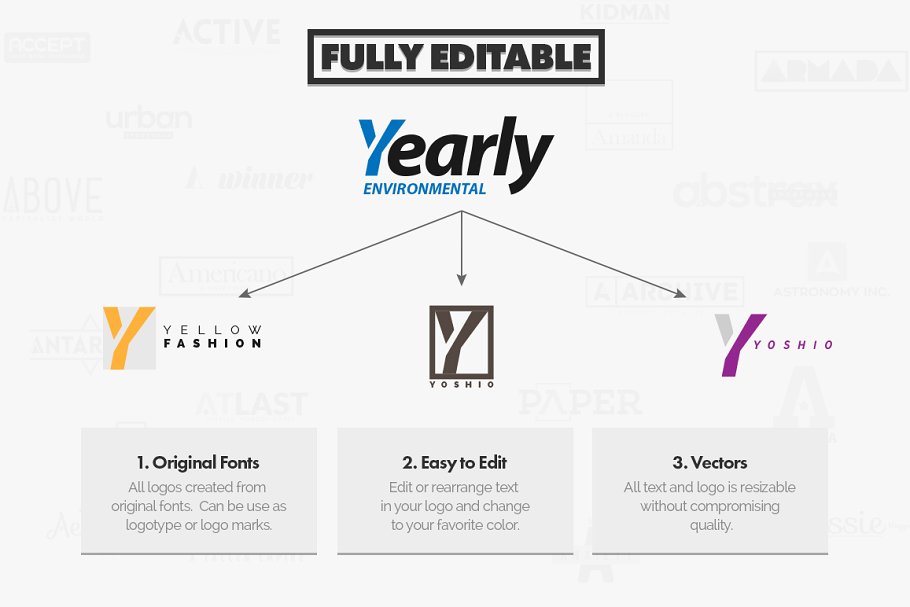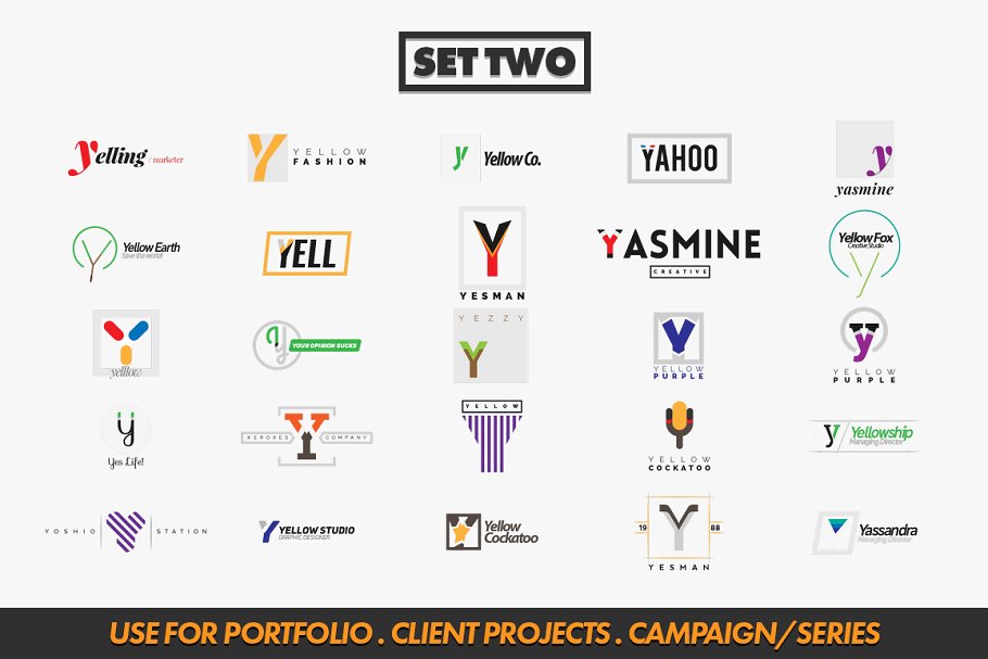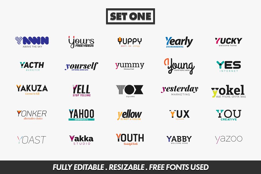 这个包为您的公司、项目或任何以字母y开头的名称提供50个徽标,您可以编辑、更改颜色、添加新文本或重新排列文本等等。
