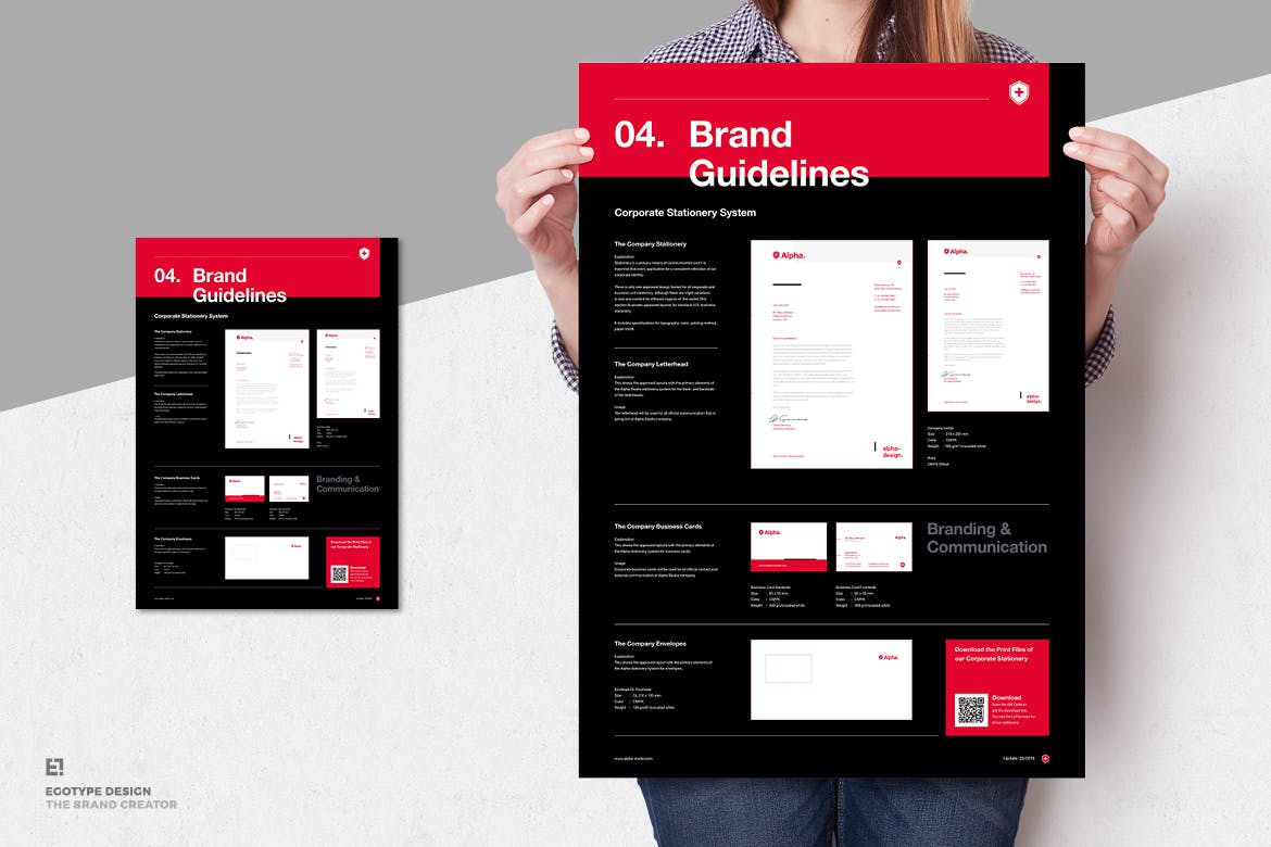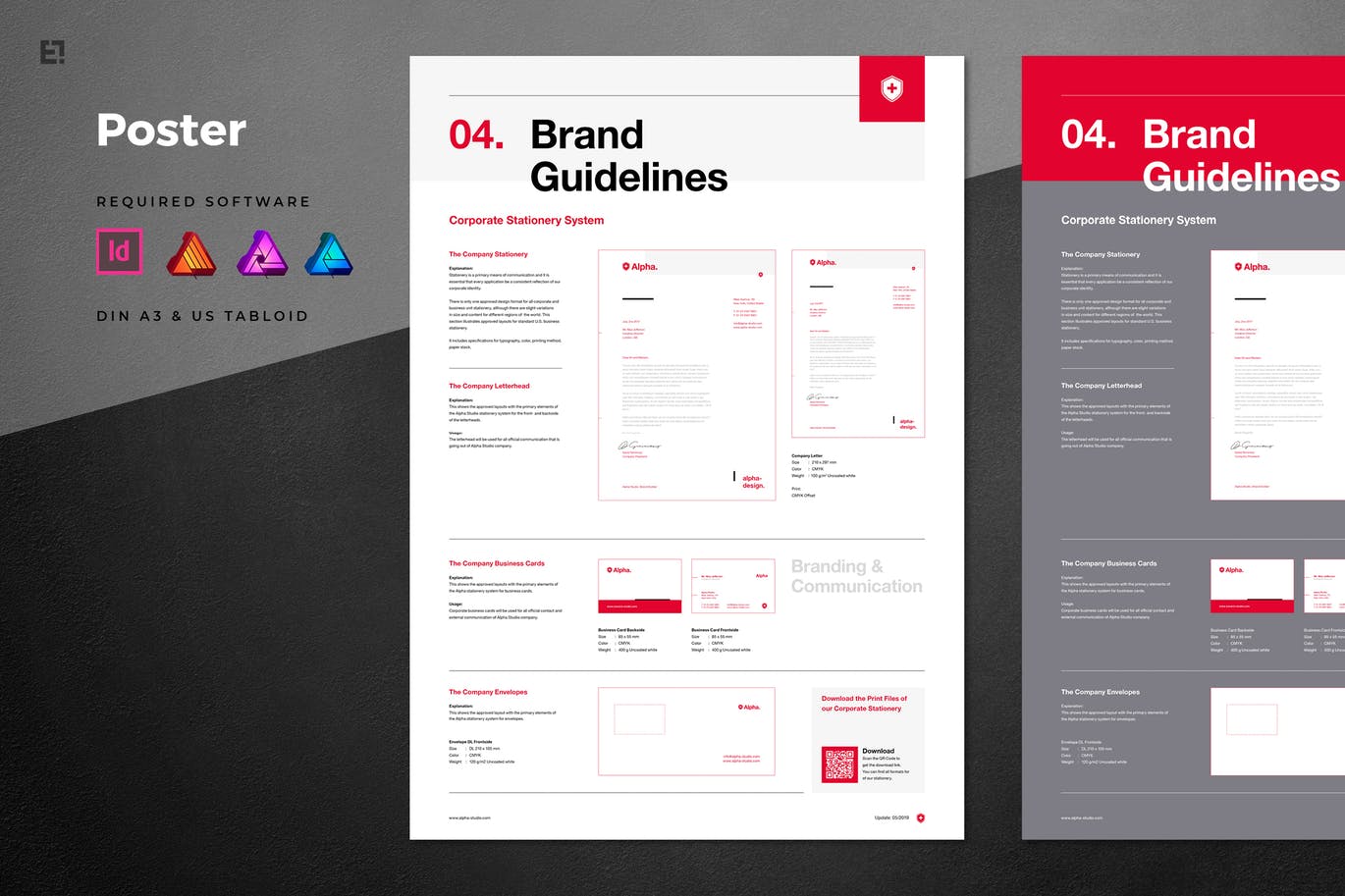 在Adobe InDesign和Affinity Suite(Affinity Publisher,Affinity Designer和Affinity Photo)中以国际DIN A3和US Tabloid格式创建的创意企业的最低限度和专业品牌手册和指南海报模板。