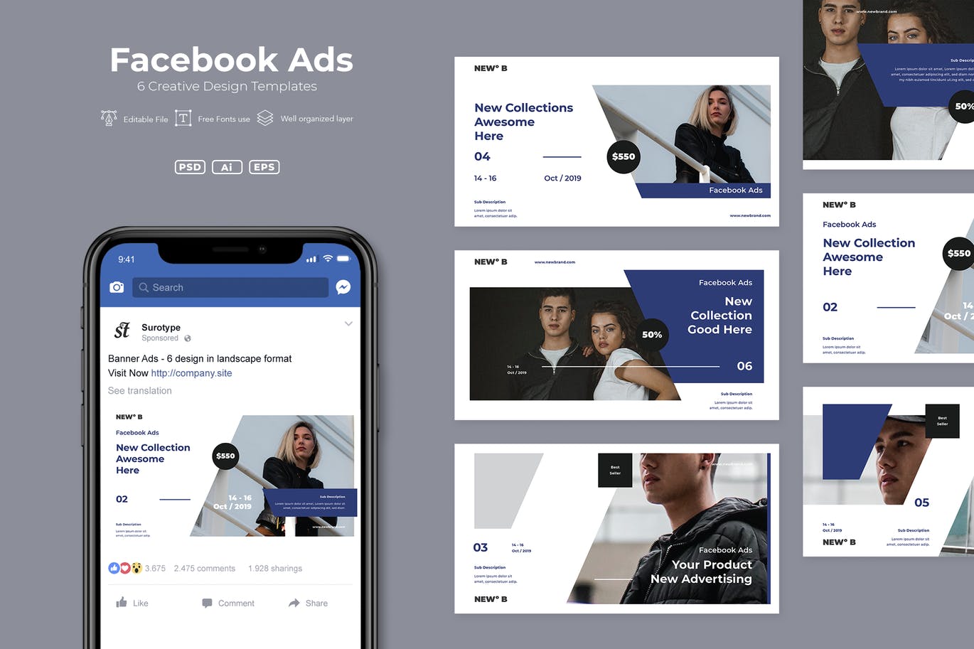这次老不湿分享的是,时尚高端简约流行风格的Facebook社交媒体banner海报着陆页设计模板 Vol.19,该套件包含6种不同的设计。
