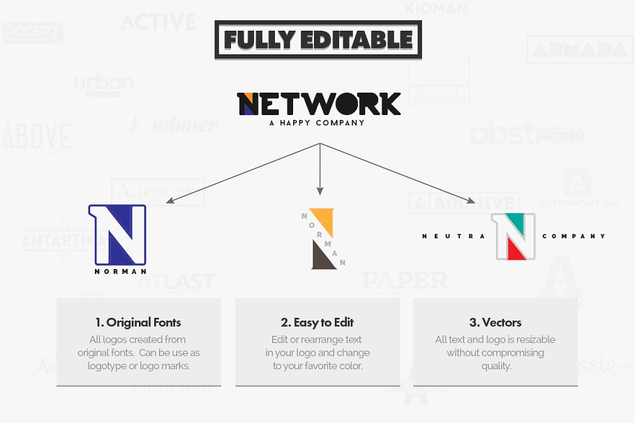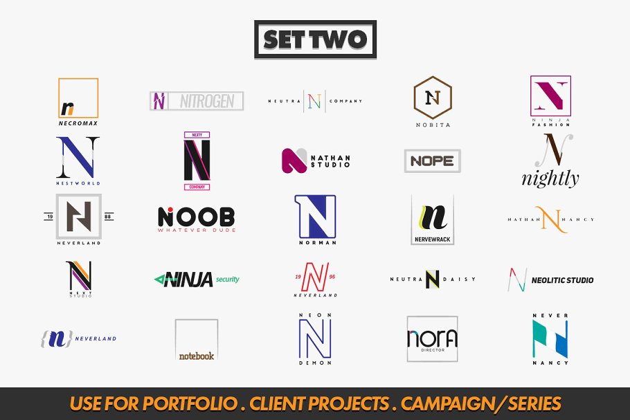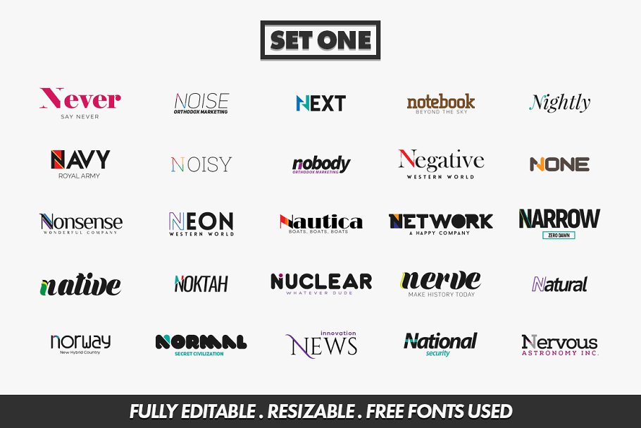 这个包为您的公司、项目或任何以字母n开头的名称提供50个徽标,您可以编辑、更改颜色、添加新文本或重新排列文本等等。
