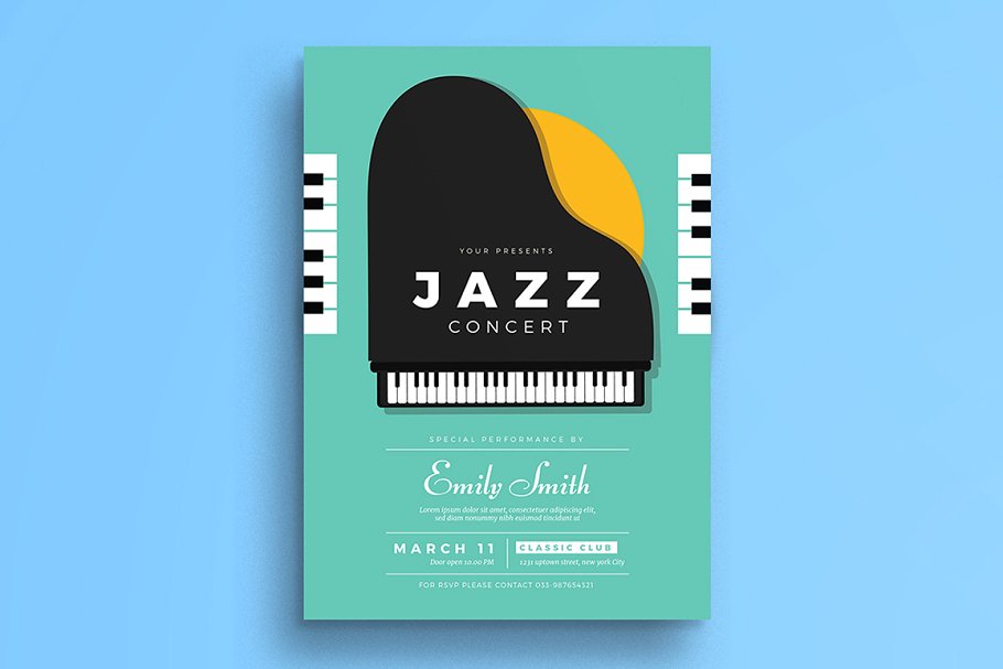 这张传单适用于任何类型的音乐,如蓝调音乐,爵士乐,音乐会,交响乐或任何你想要的