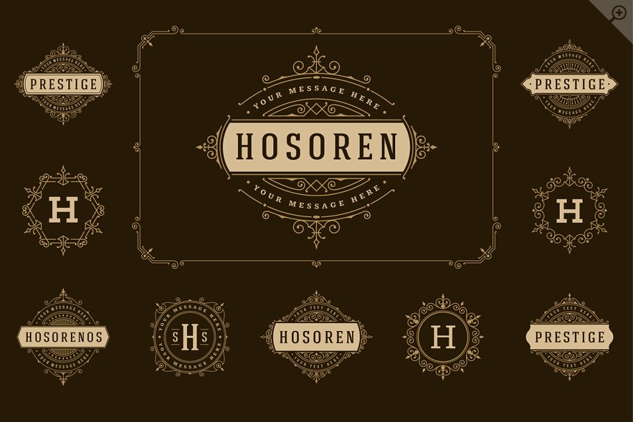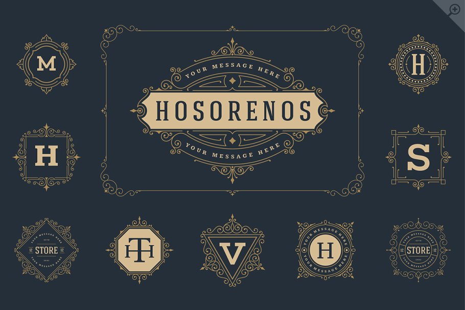100个复古皇家豪华饰品线标识、字母组合、徽章和标志。豪华优雅的框架装饰线矢量插图。