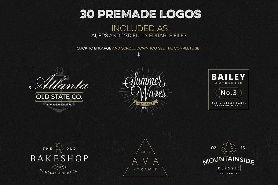 这组合集中包括了300个元素,10个纹理和40+建议字体+ 30个预制标志和20个印刷标志,无论你是Photoshop用户还是Illustrator用户,都可以创建成千上万的高质量logo。