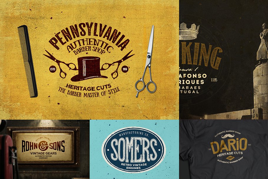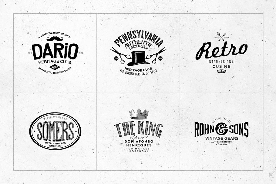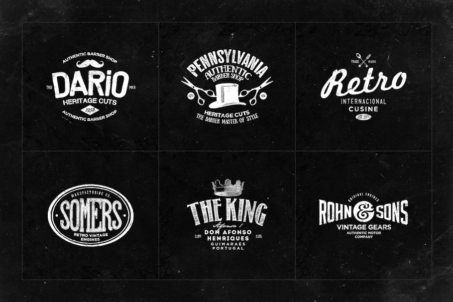 这组合集包含了6个复古标志模板,非常适合用于品牌项目、服装设计、字体设计、企业标识、包装产品设计等。
