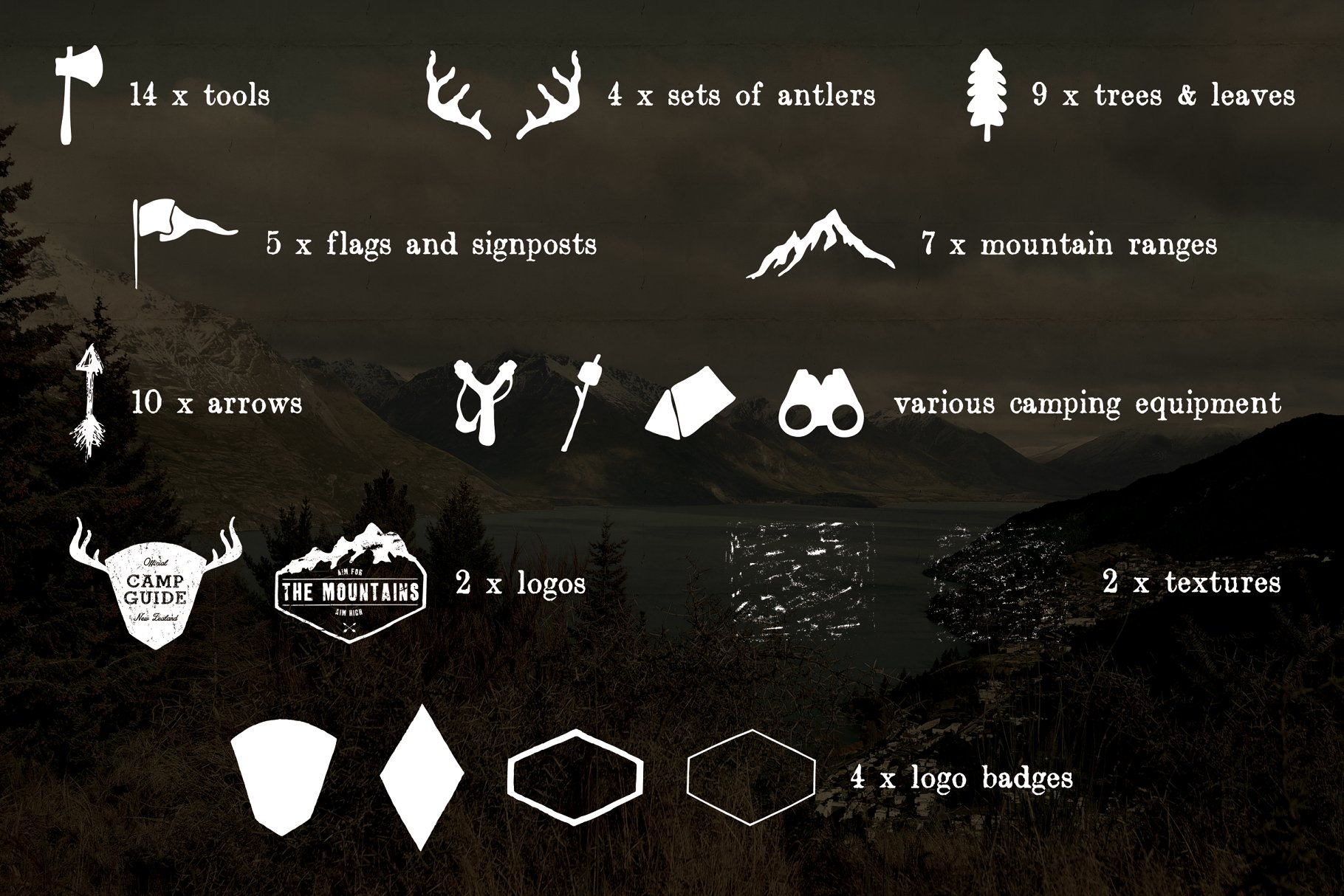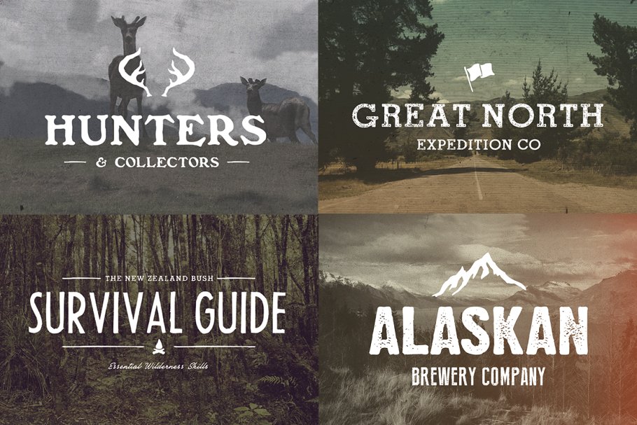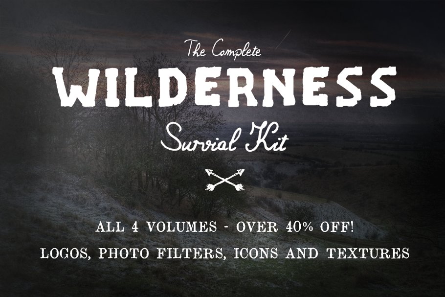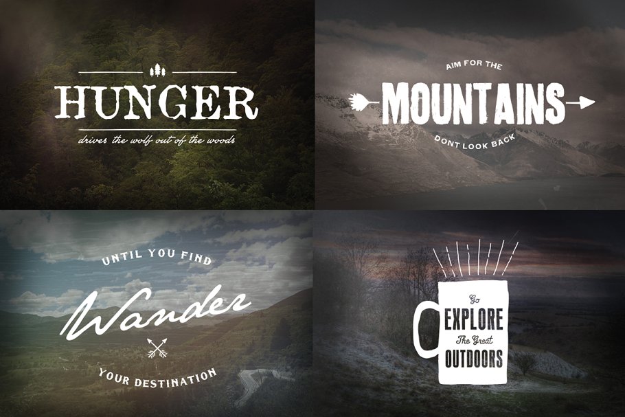 这组野外生存主题的素材合集包括了大量手工绘制的野生灵感图标,标志模板,照片过滤器和纹理等。