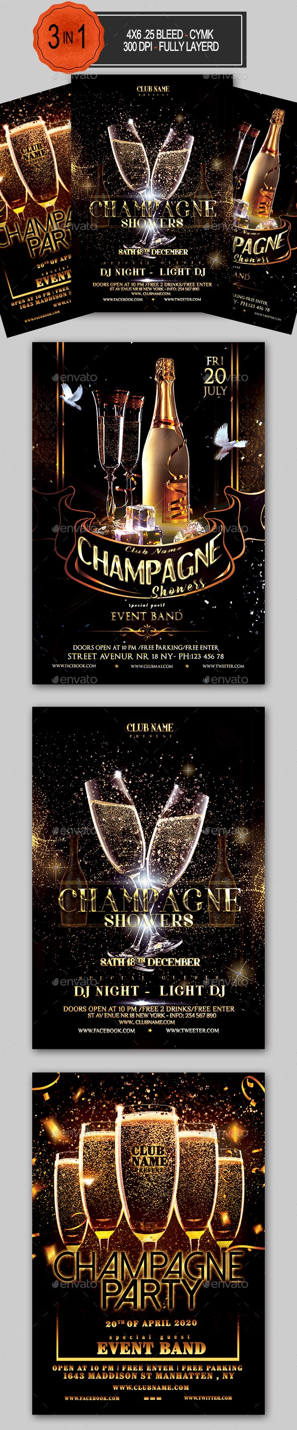 这款传单模板套装将是您推广活动/派对的完美方式。非常适合活动邀请、香槟派对、俱乐部宣传、酒会宴会邀请等。