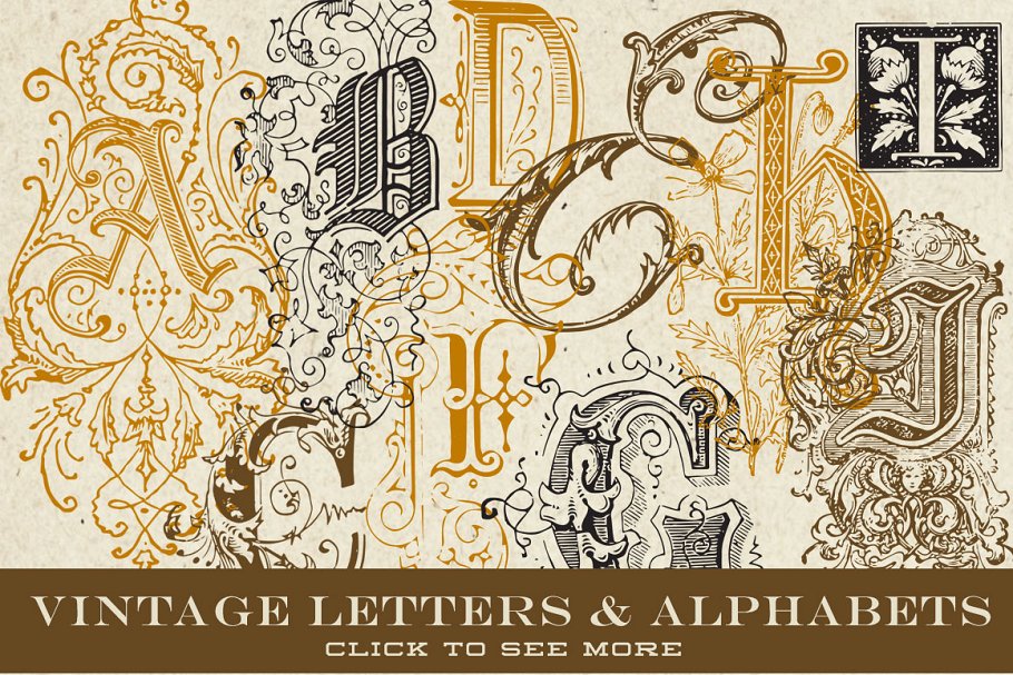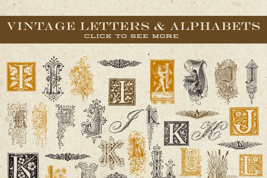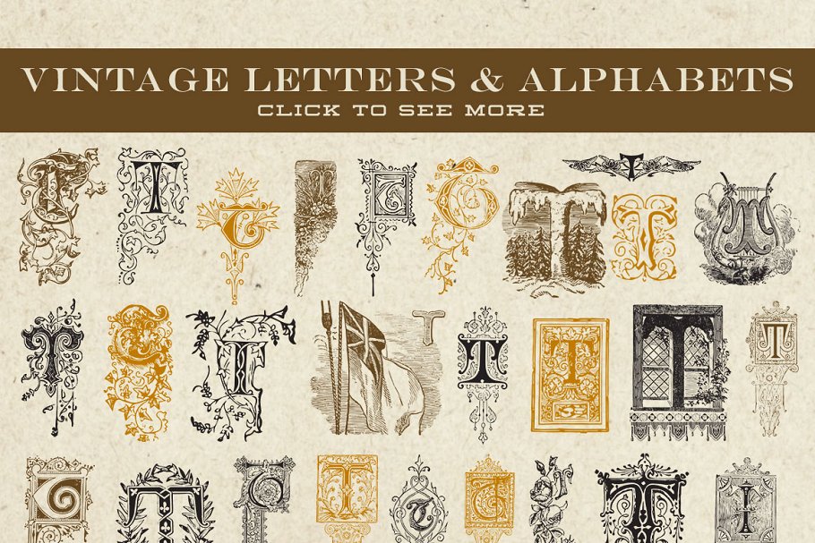 这是一组复古的矢量字母和字母组合图形,总共有379个字母从19世纪初到19世纪晚期的各种事物中精心挑选出来的。他们没有是直接从原始的背景中提取出来,然后再进行矢量化。