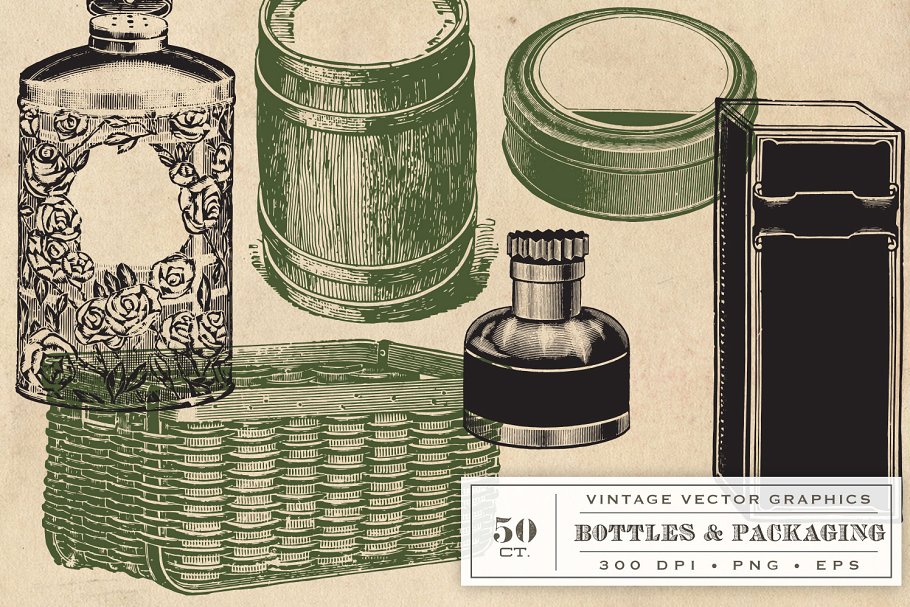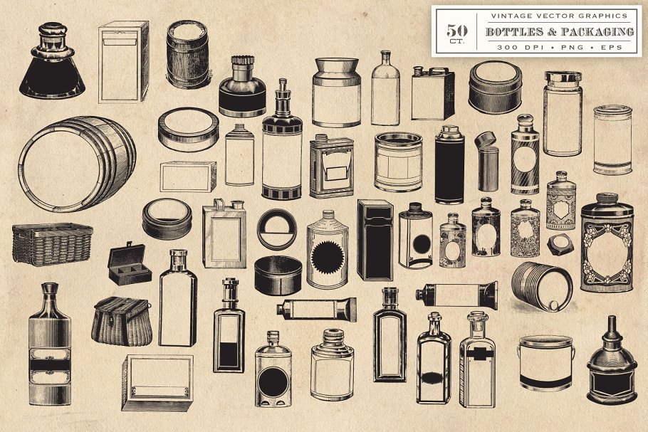 这组图形合集包括了50个古董瓶子、盒子、罐子、管子和篮子,图形的收藏来自于1911年出版的古董目录(内部)。他们被扫描、编辑和追踪成矢量形式,并在不影响古董图像完整性的情况下进行清理。