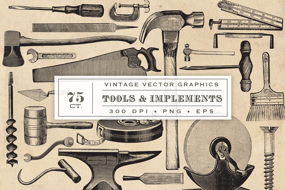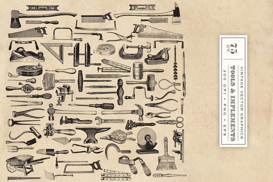 这组素材合集包括了75个古董工具 &图形工具,灵感来自于1911年出版的古董目录(内部拥有),包括木工、农业、铁匠、园艺和其他工具。