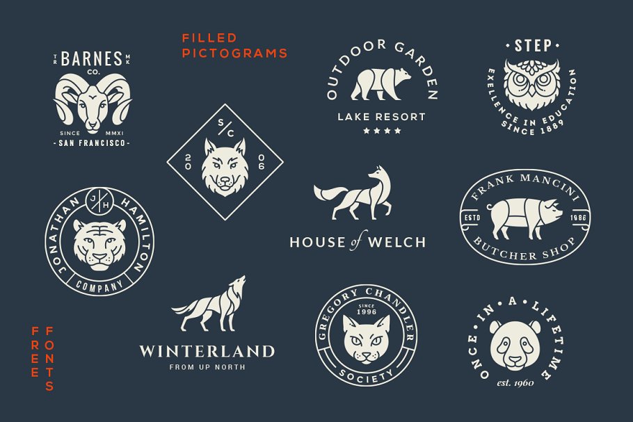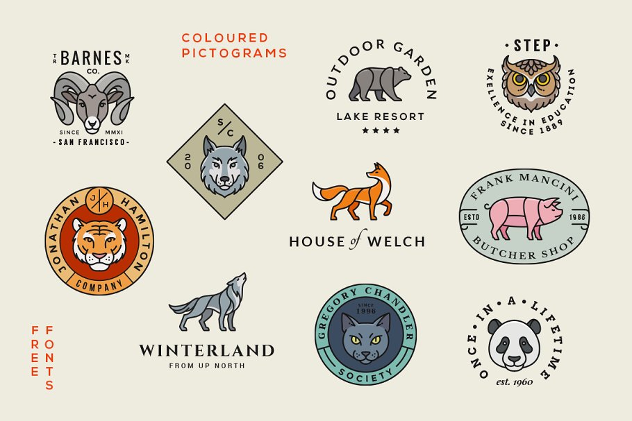 可用于品牌项目的10个动物标志模板的组合, 服装设计或任何你能想到的东西。用你自己的拷贝编辑文本就可以了