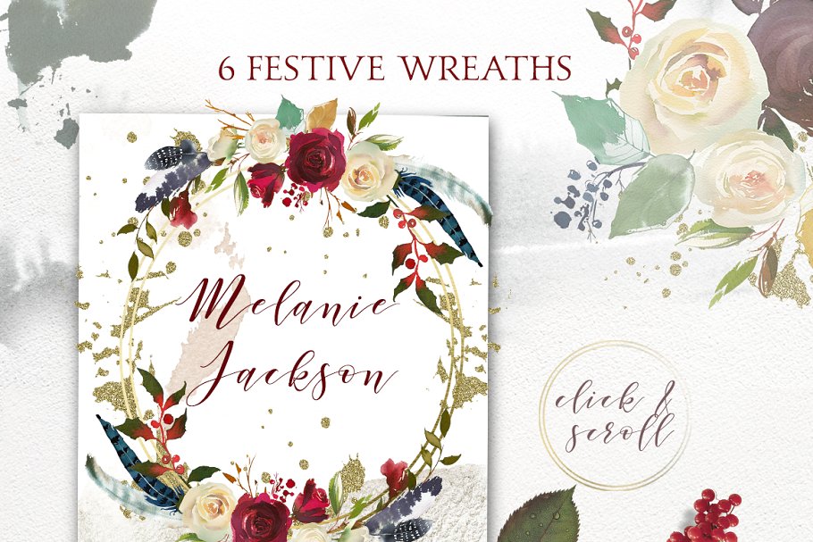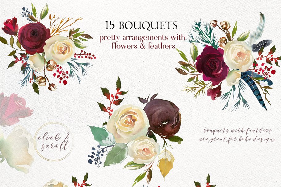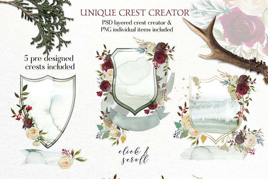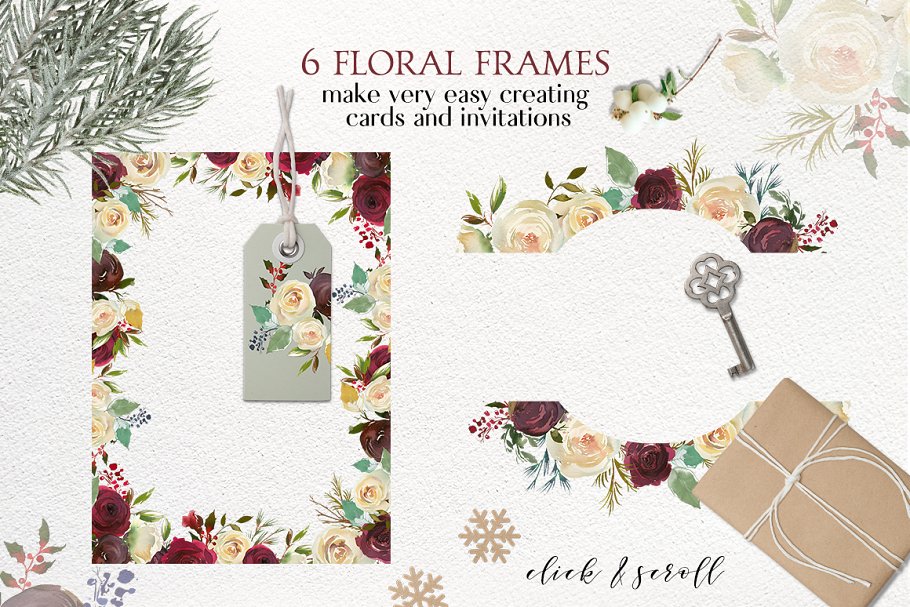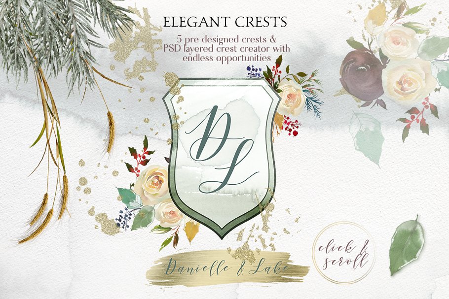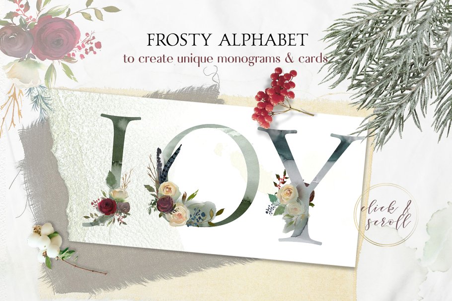 严谨的冬季 -一个包含了花束、花环、框架、无缝模式、优雅的字母、独特的波峰的创造者、以前设计的商标和卡片、水彩设计资源等大型设计套件。