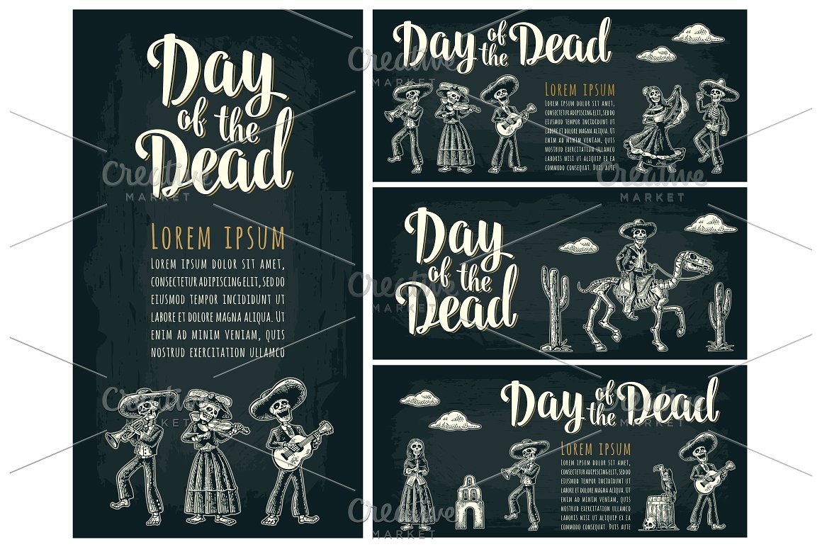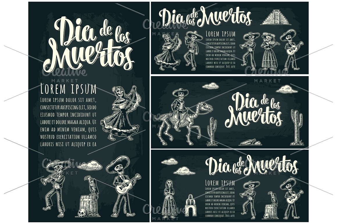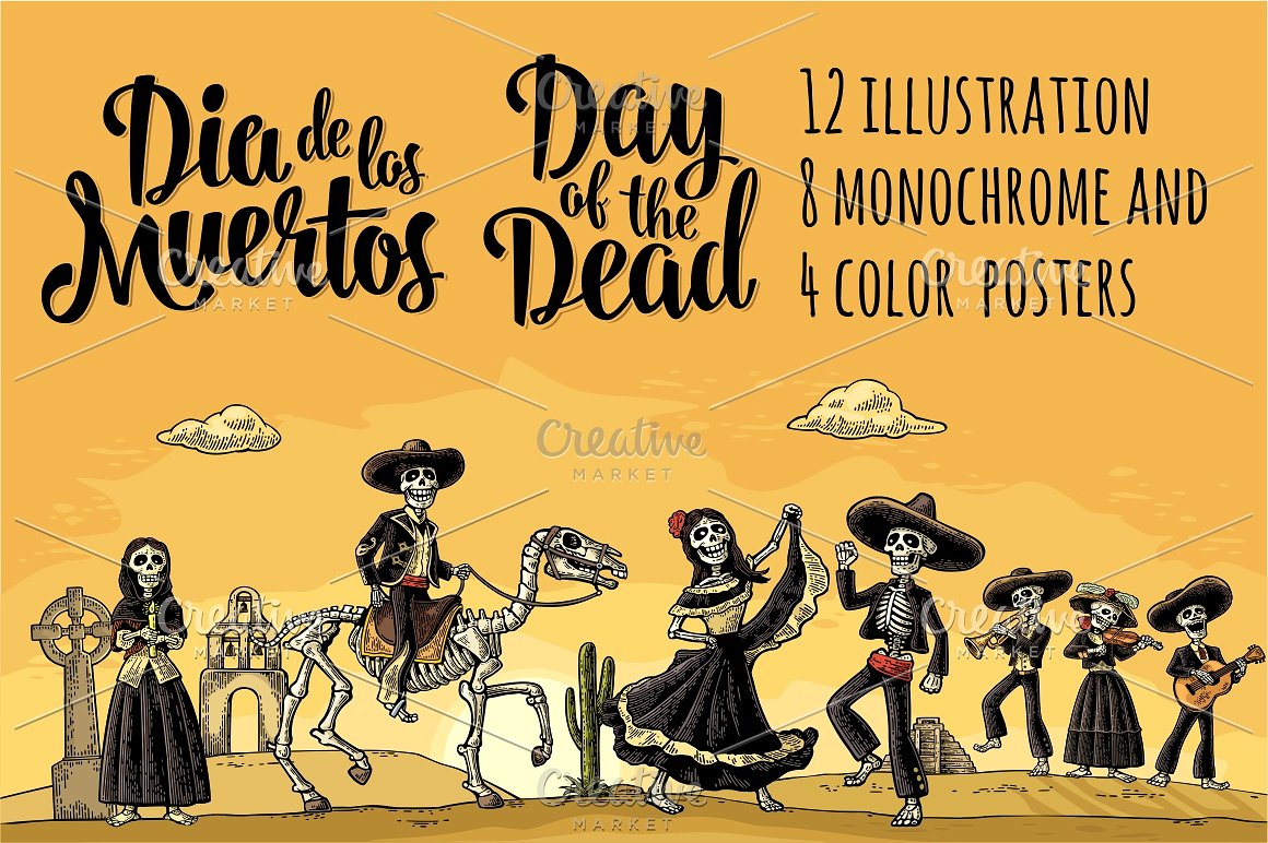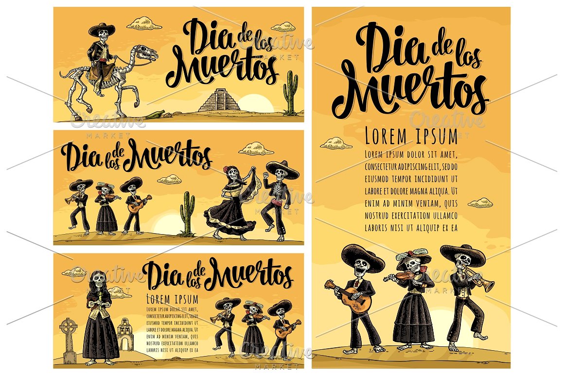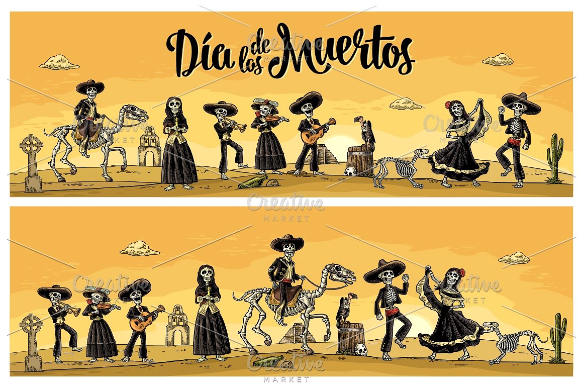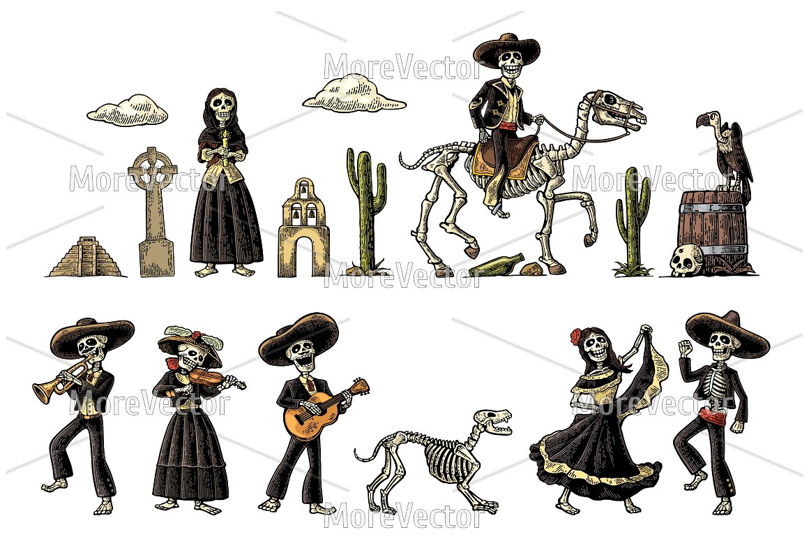 大捆墨西哥骨架,Dia de los Muertos和死亡刻字。墨西哥民族服装的骨架舞蹈,唱歌,弹吉他,小提琴,小号。矢量复古雕刻孤立和全景沙漠与仙人掌和日落与云.